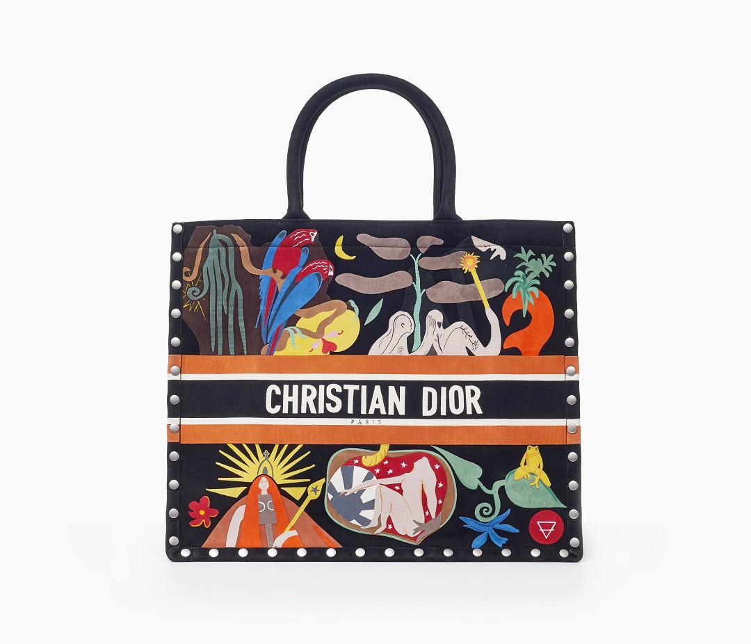 2018年春夏首次亮相的 Dior Book Tote 托特包在秋冬再次推出新款,绒面小牛皮材质,通过皮革拼接工艺呈现色彩丰富的立体图腾,边缘融入复古铆钉装饰,外观方正简洁又兼具实用性。