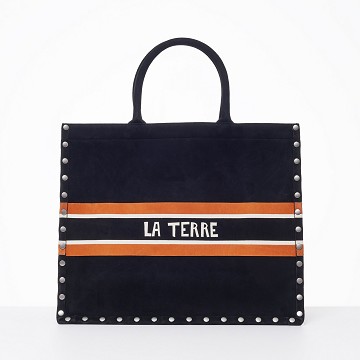 包袋由绒面小牛皮缝成,黑色为衬底,中央一条橙白黑三色的横带贯通,正面拼贴「CHRISTIAN DIOR」标志,背面镶嵌法语「LA TERRE」(地球)。皮革切口处仍保留了一点点毛边,增加了绒面皮的质感。