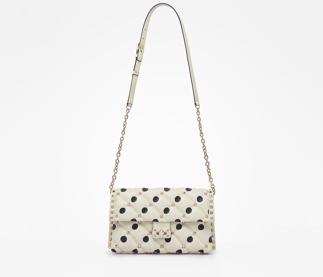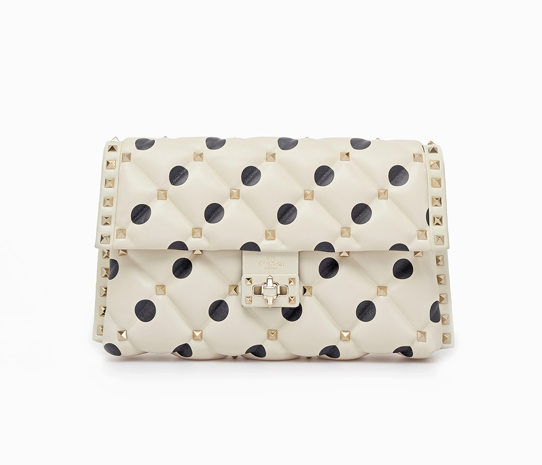 波点(Polka-dot)图案在近几年重新成为时尚圈热门元素,这款包袋使用的是最百搭的白底黑点印花,铆钉装饰在复古甜美中融入一丝摇滚气质,无论裙装或裤装都能完美驾驭。