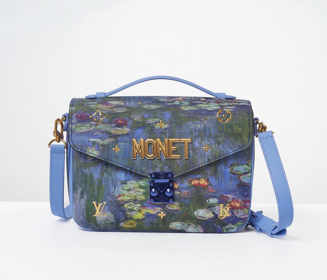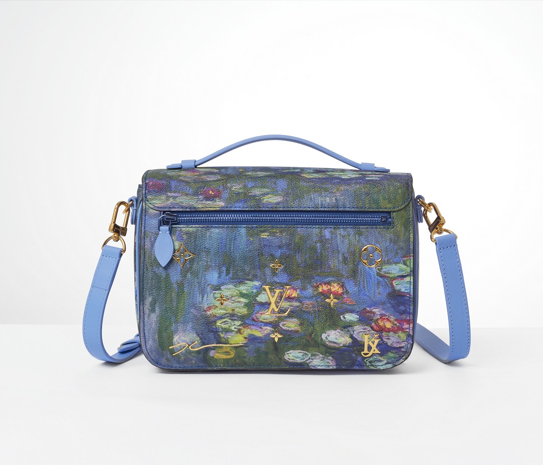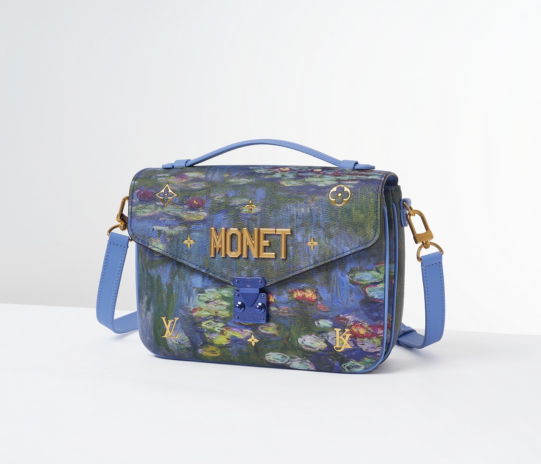 涂层帆布上还原了凹凸的油画质感,正面是莫奈的名字——「MONET」,金属的亮眼与油画色彩形成完美对比。Monogram 图案首次被改动,加入了 Jeff Koons 的首字母缩写 JK 以及他的个人签名,以烫金工艺呈现,是包身闪亮的装饰。