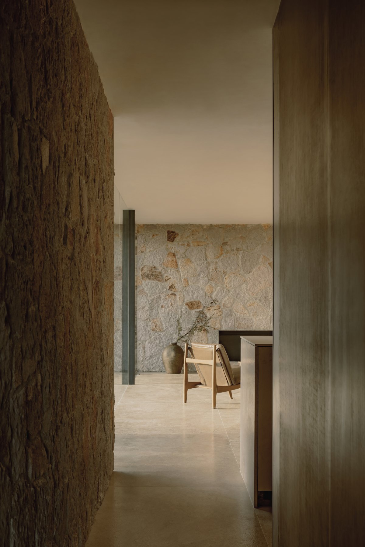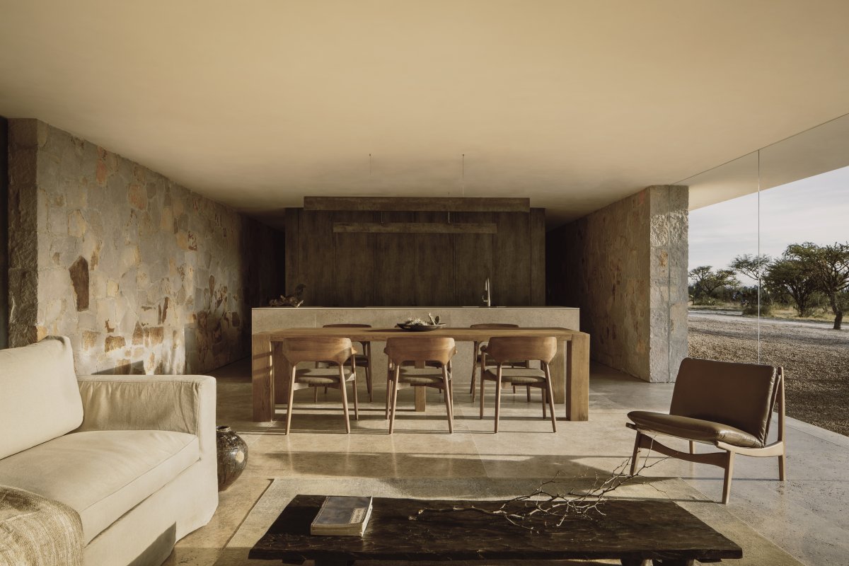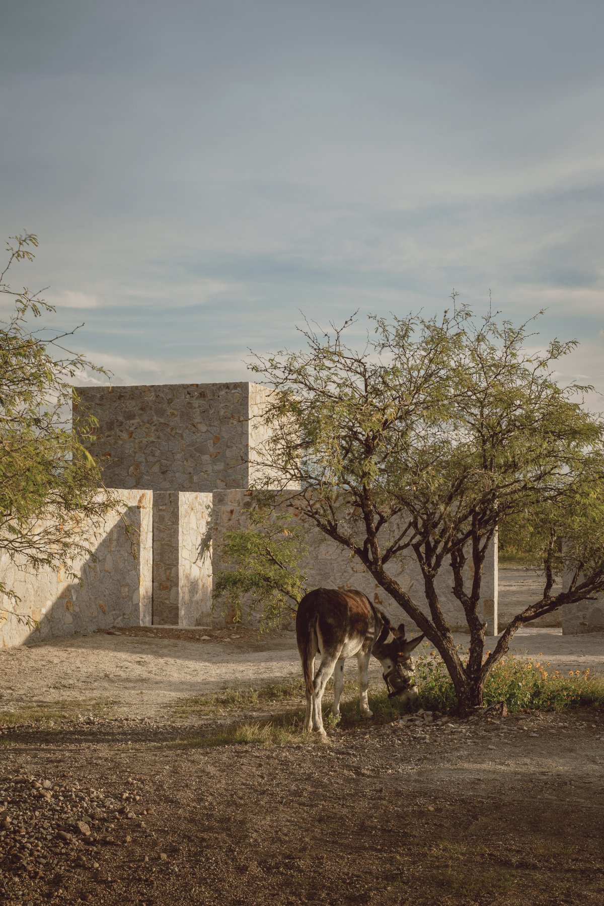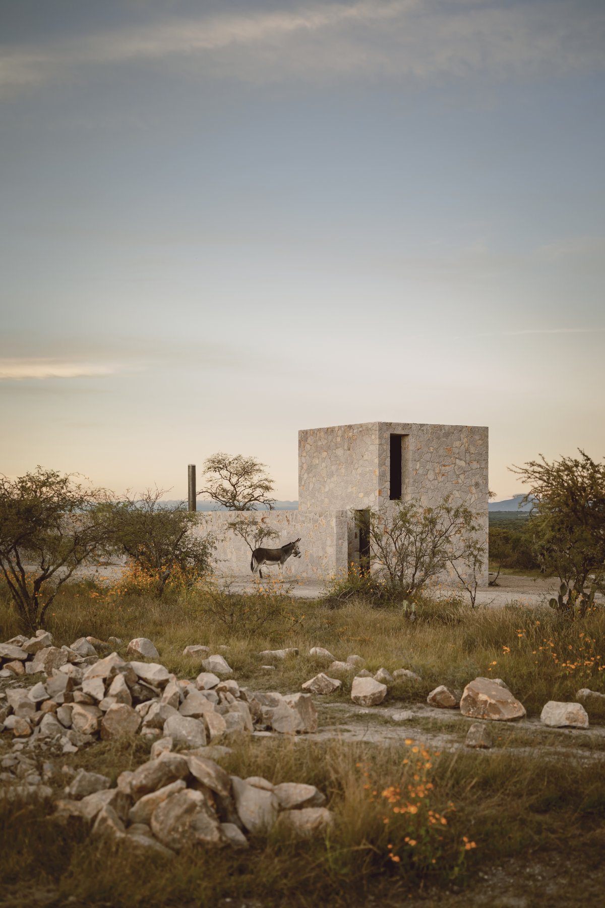 In the third quadrant is the one-bedroom house; the public spaces are separated from the private ones by a single volume containing bathrooms, dressing room, and service area, which breaks with the open floor plan. In the fourth quadrant is the office; this is the only visibly prominent vertical element that contrasts with the horizontality of the landscape and the rest of the elements, seeking with this gesture to flirt with the iconic volumes of the Santa Brigida mine in Mineral de Pozos.The dispersion of these spaces forces a permanent pilgrimage between spaces; it makes you come into contact with the earth, the air, and the mountain as if it were an ancient monastery, framing the landscape but at the same time forming a natural part of it.