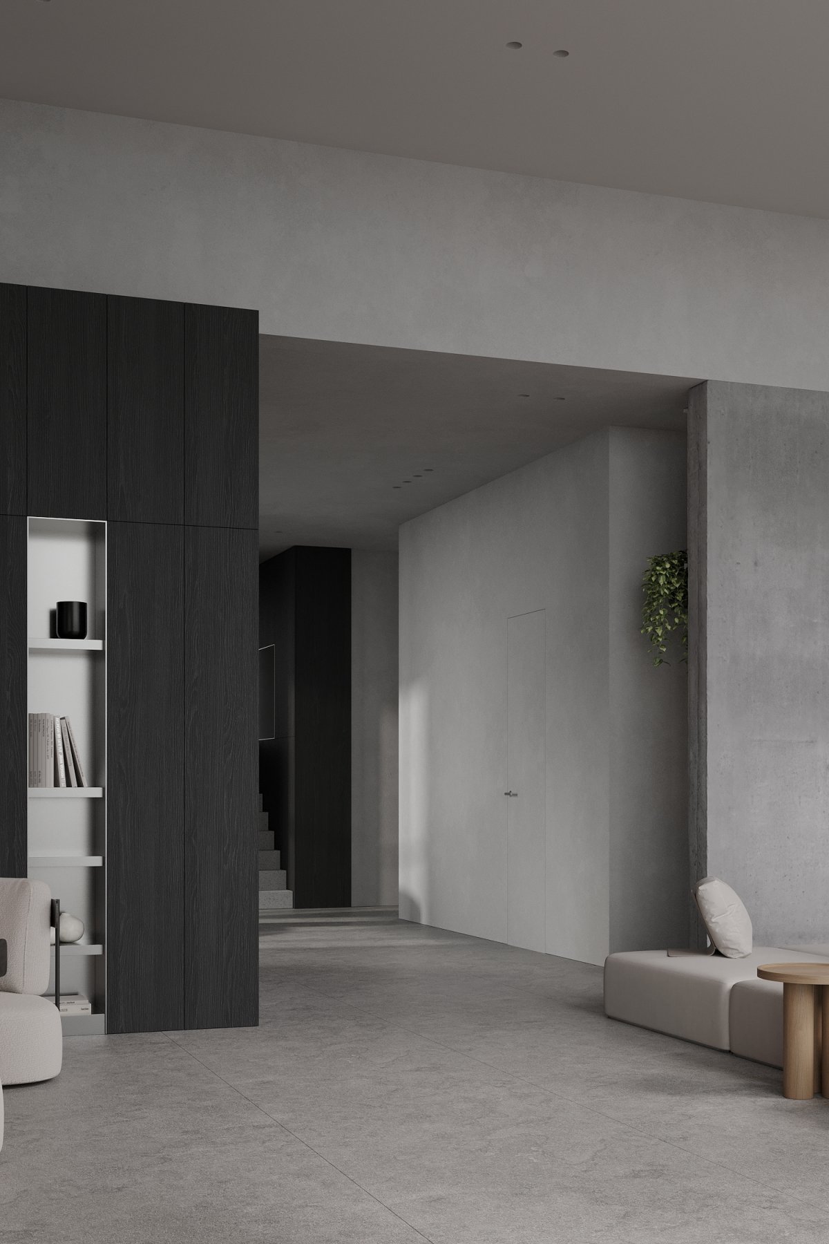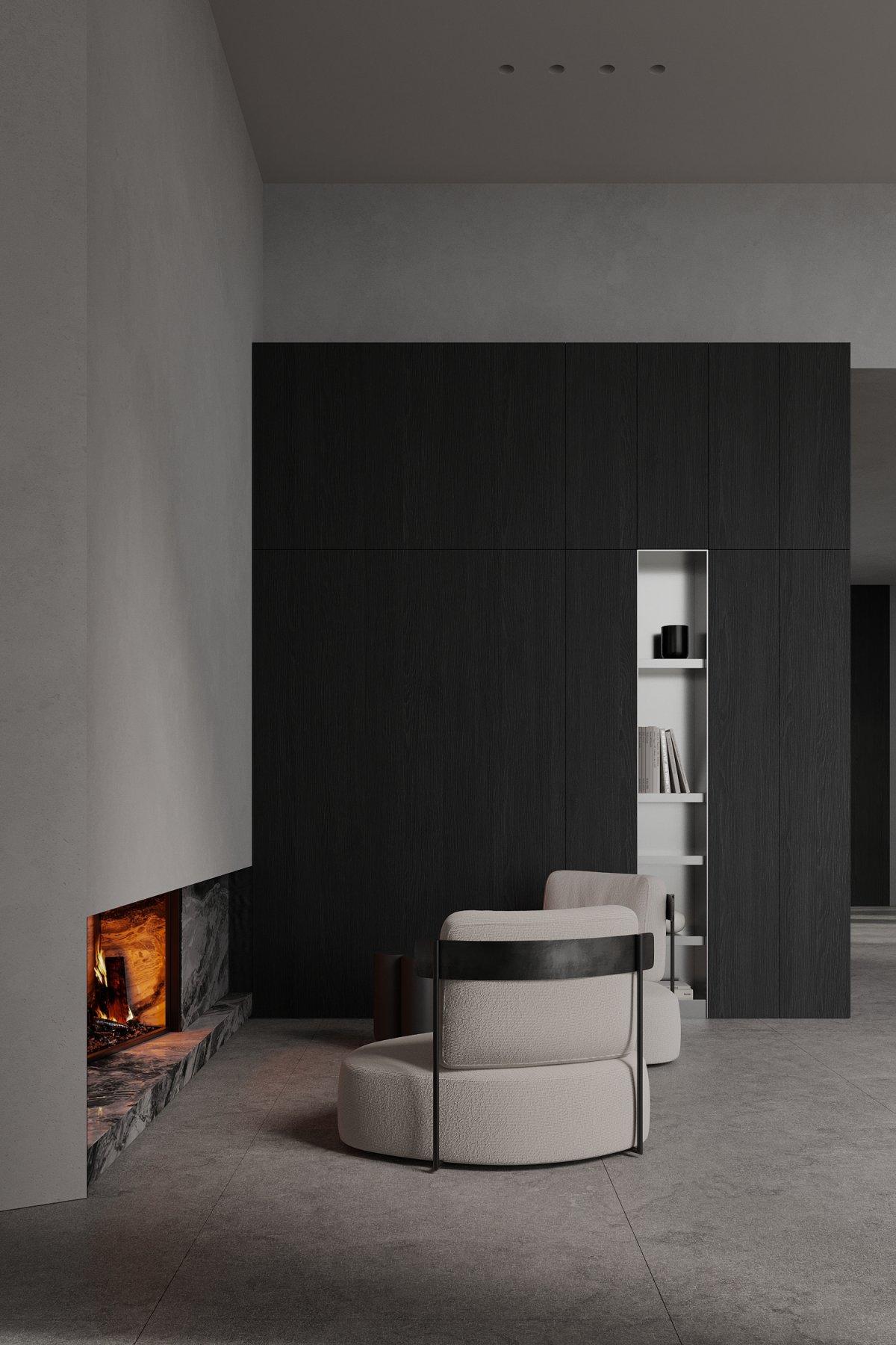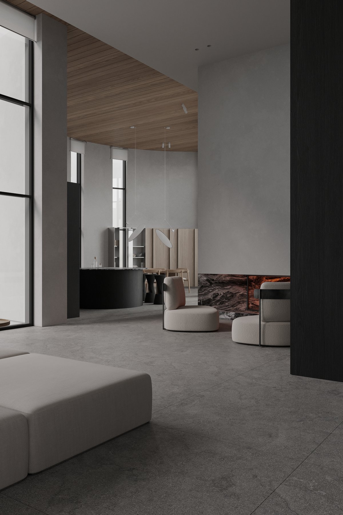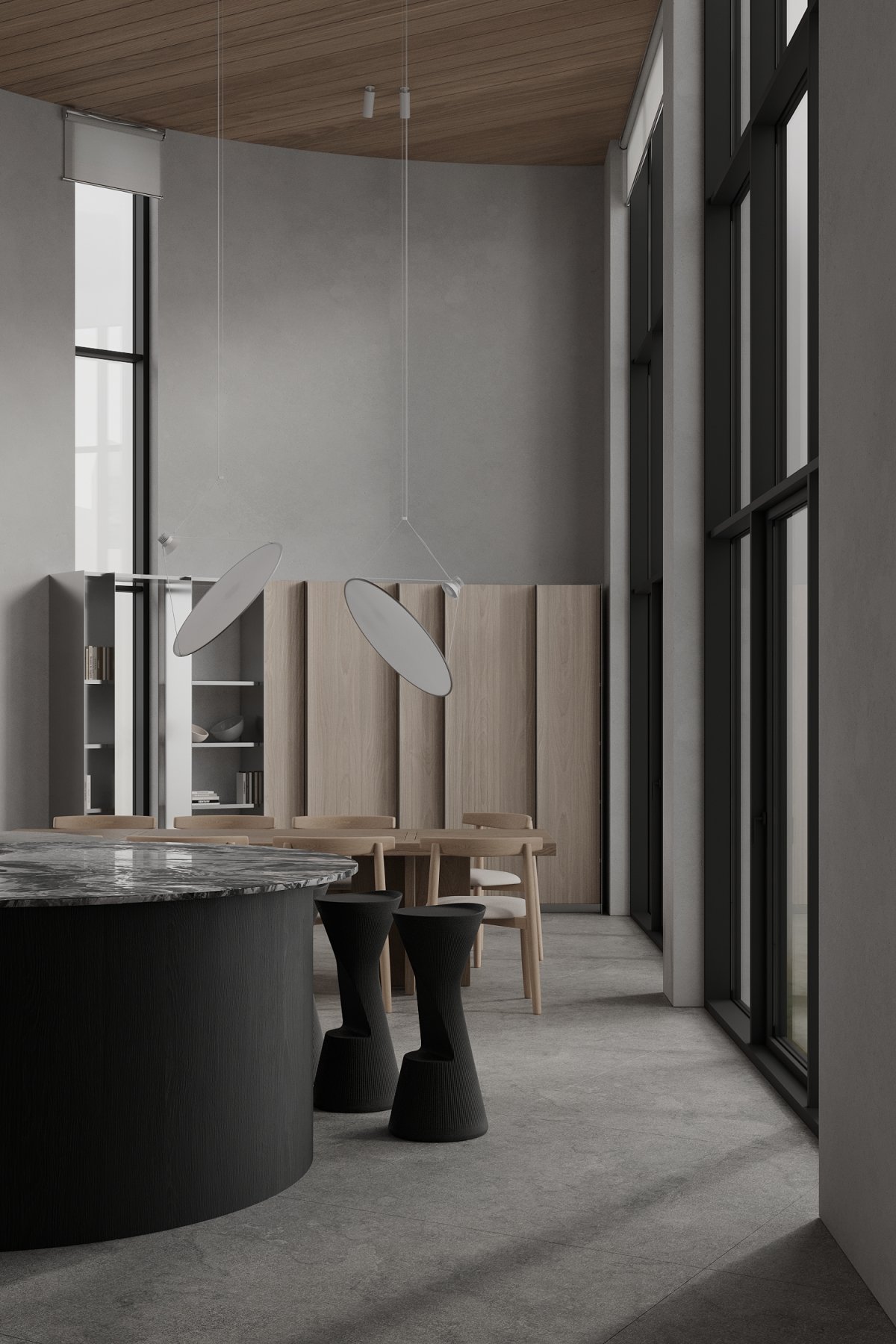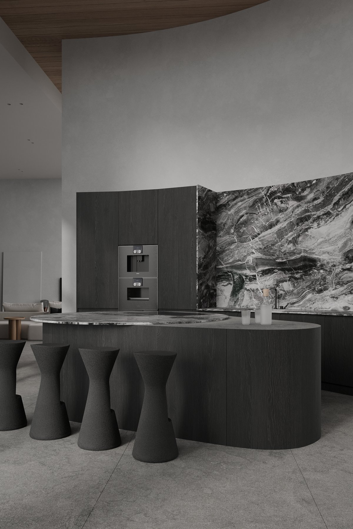 The structure of the building allows ZE Workroom to create an unusually shaped kitchen, which has an oval shape that complements the contours of an island. These custom solutions are highlighted by dark finishes that contrast with the monochromatic interior and high natural stone, which they use as the main prominent material throughout the house.