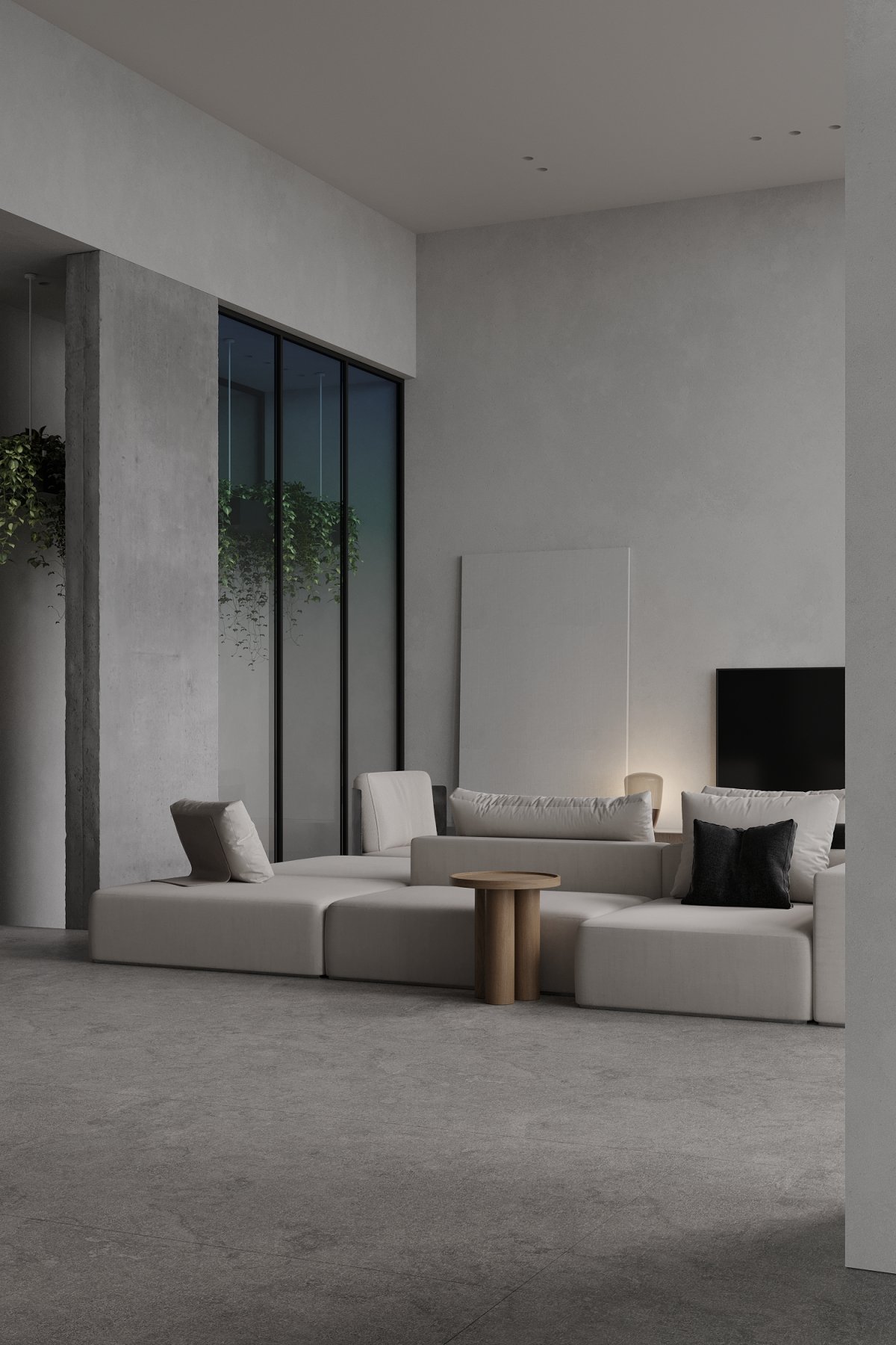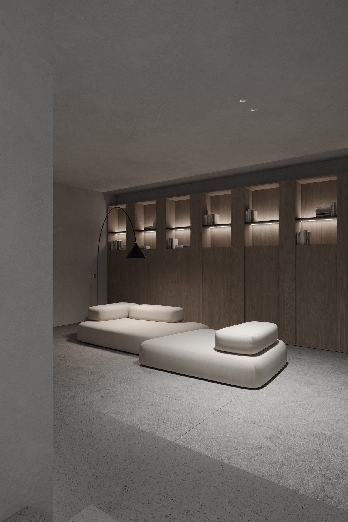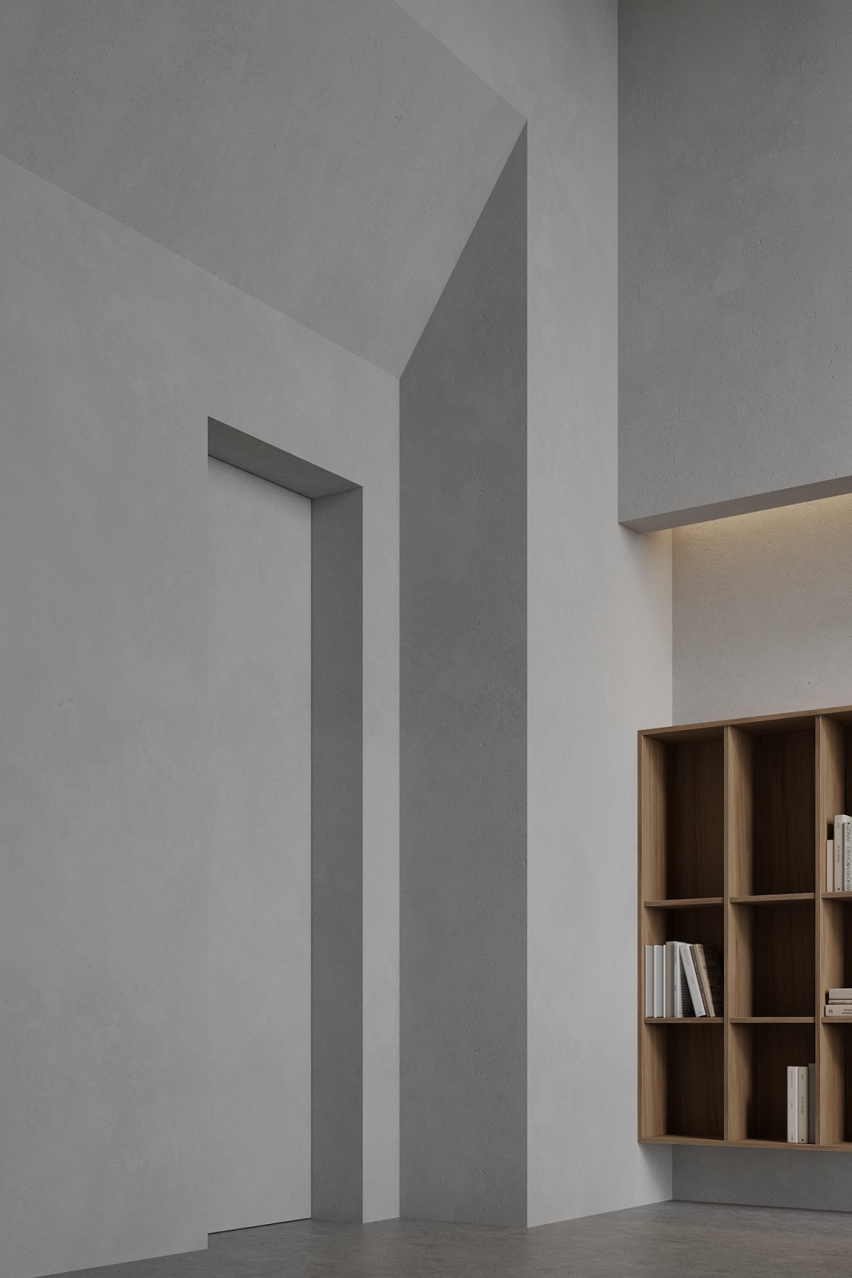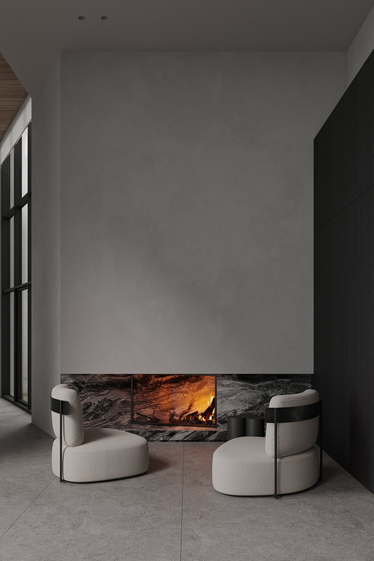 The structure of the building allows ZE Workroom to create an unusually shaped kitchen, which has an oval shape that complements the contours of an island. These custom solutions are highlighted by dark finishes that contrast with the monochromatic interior and high natural stone, which they use as the main prominent material throughout the house.