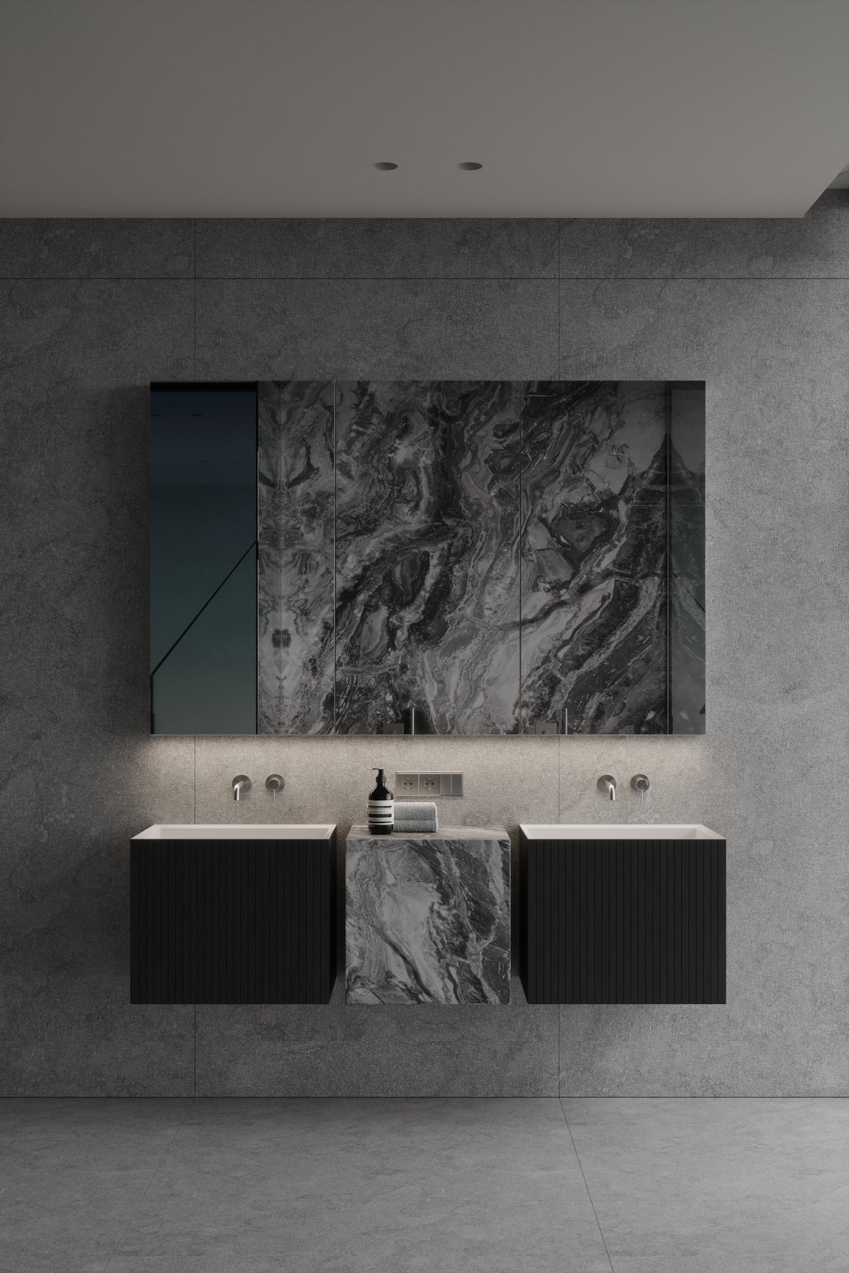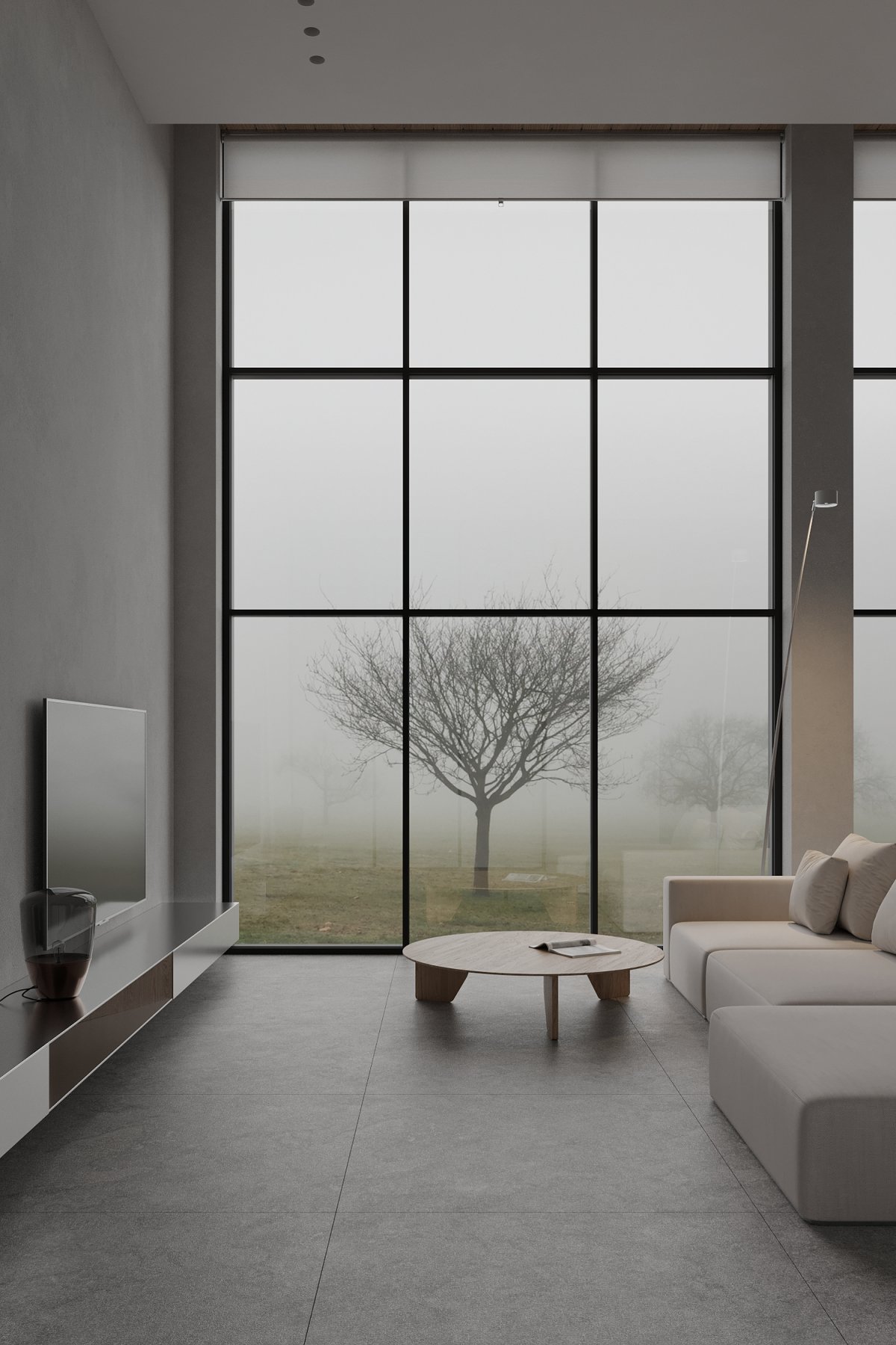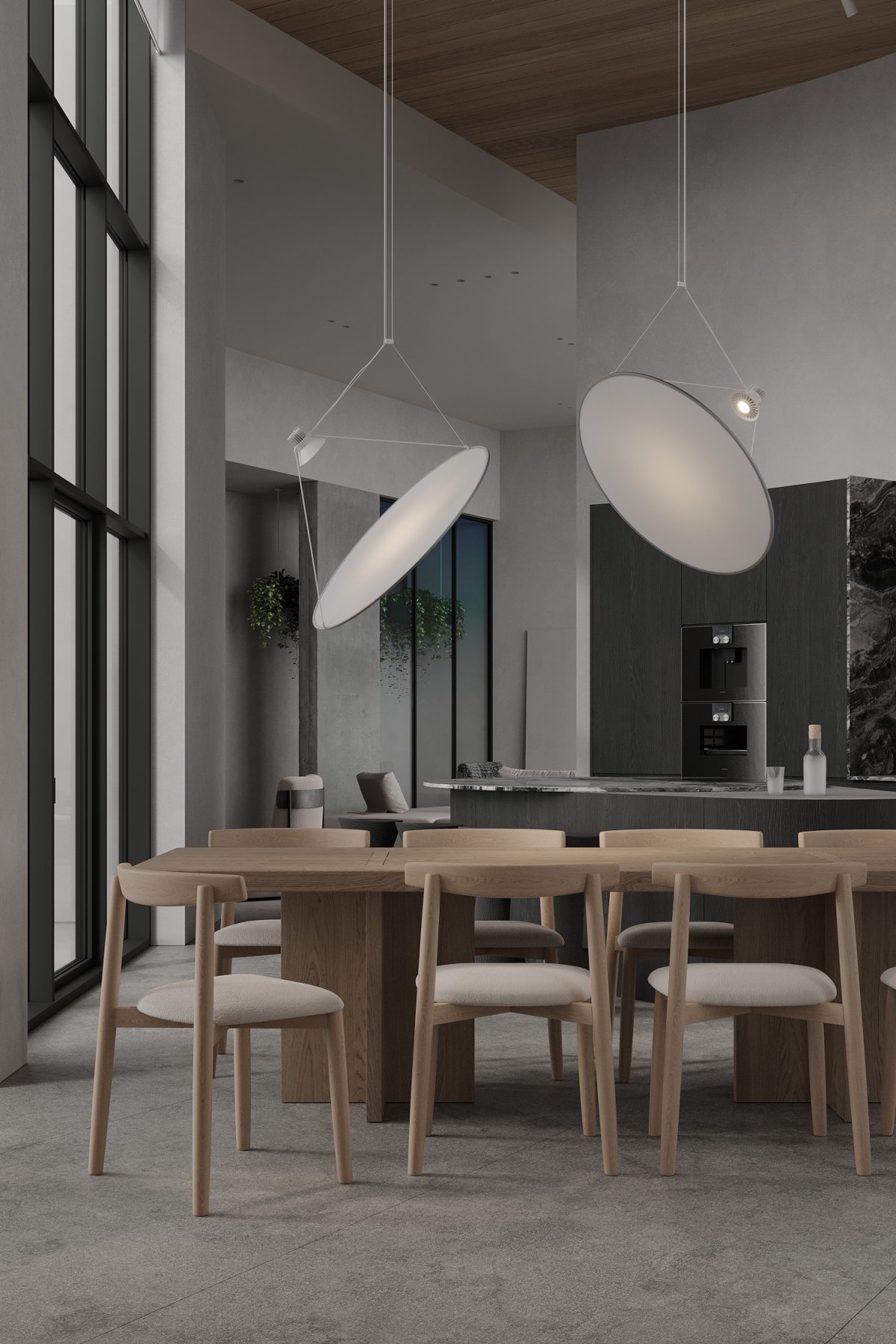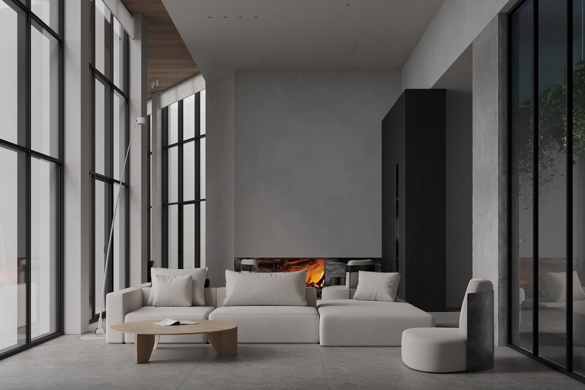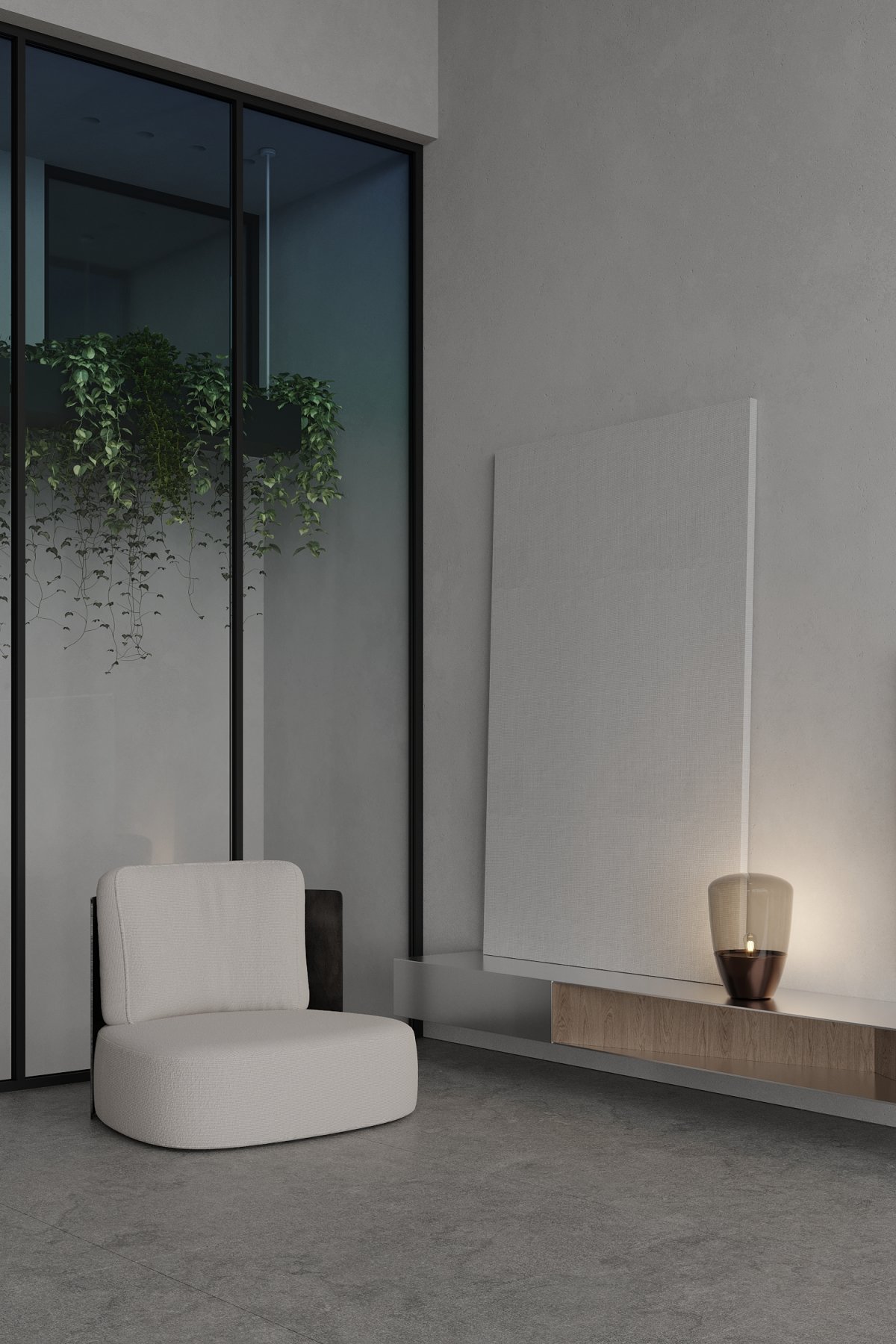 The structure of the building allows ZE Workroom to create an unusually shaped kitchen, which has an oval shape that complements the contours of an island. These custom solutions are highlighted by dark finishes that contrast with the monochromatic interior and high natural stone, which they use as the main prominent material throughout the house.