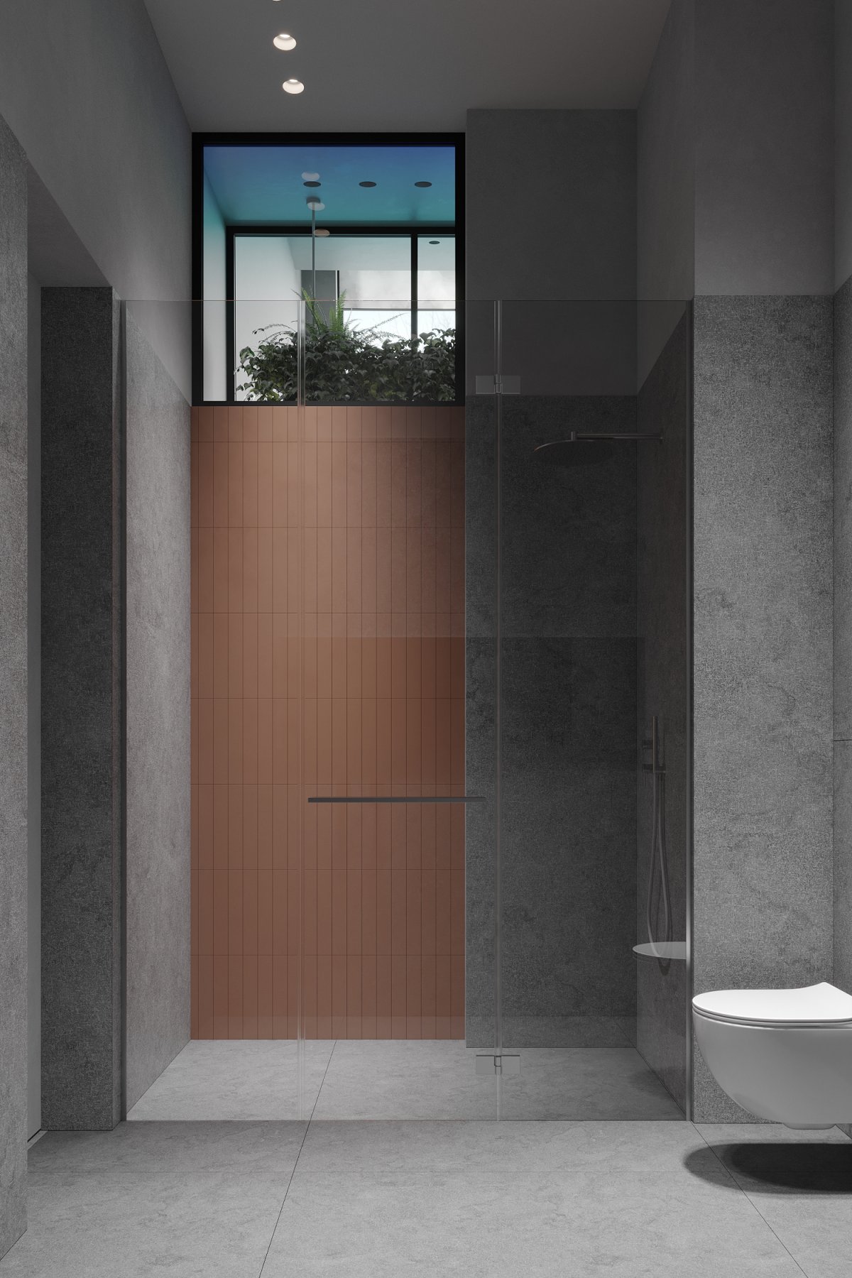 The entire interior references the surrounding landscape with a simple palette thanks to the blue accents on glass and natural materials. The highest ceiling in the interior is close to 5 and a half meters. Echoing the dark brown and black finishes, each area is independent, separated by colored glass partitions and creating a sense of intimacy. The “suspended” sunbeds, semi-circular shower and sauna emphasize the architectural solutions and important details.