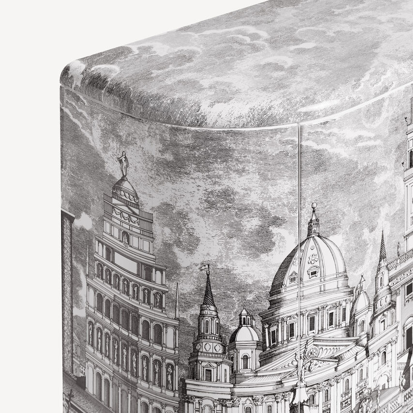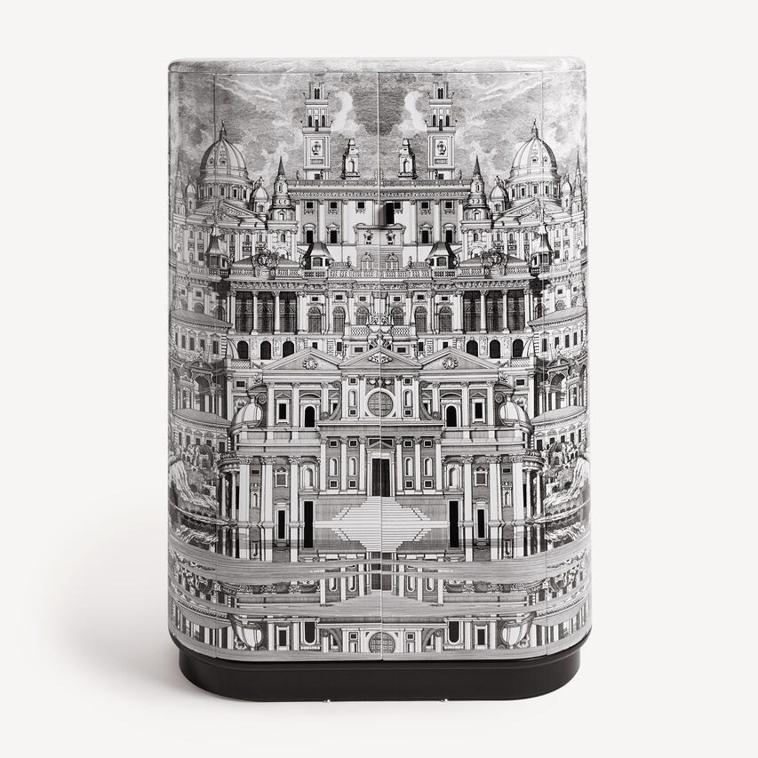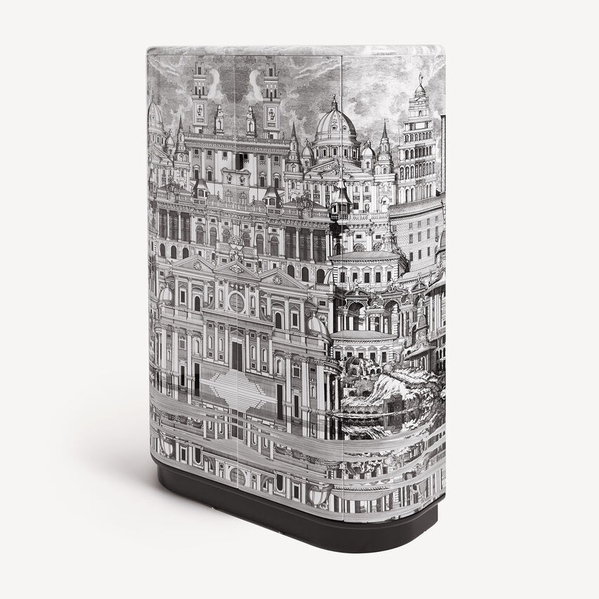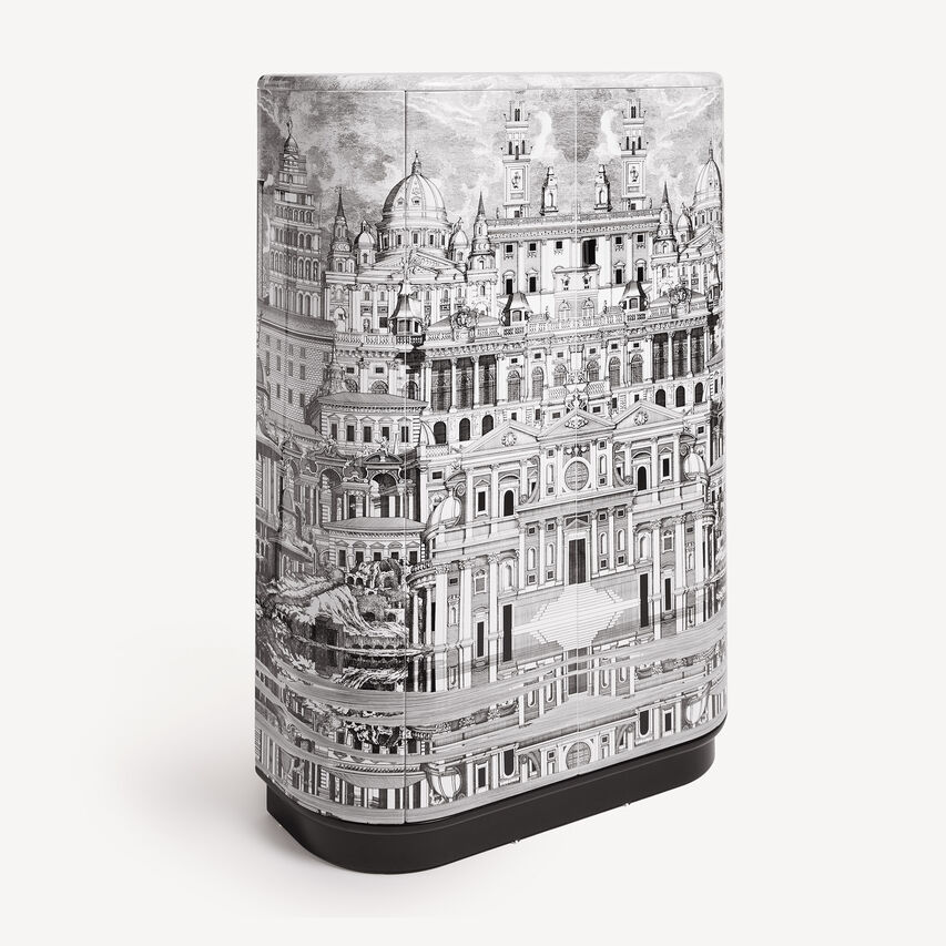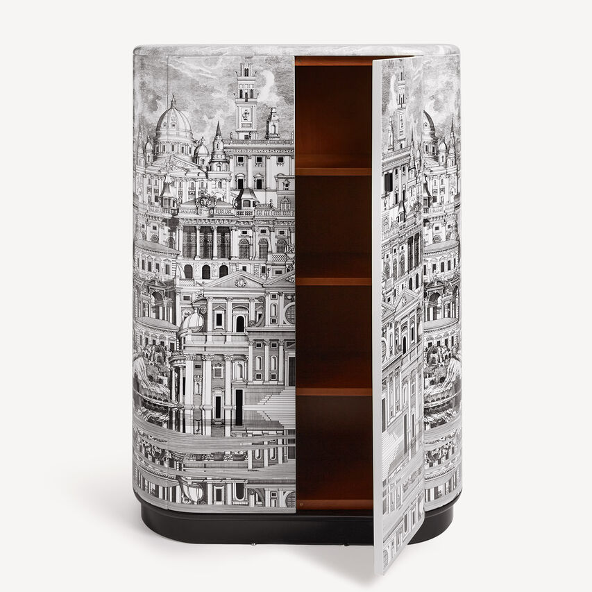 这款橱柜以其优雅的圆形形状迅速成为有史以来最受欢迎的经典之一。手工丝网印刷和上漆,点缀着一座想象中城市的超现实装饰。
