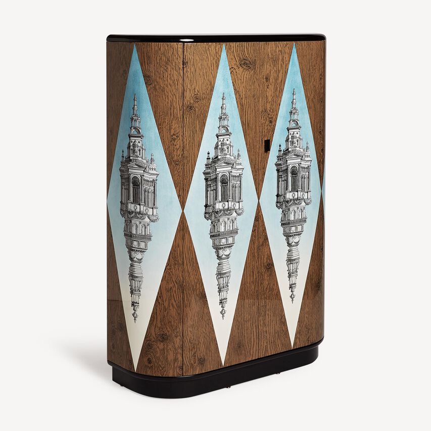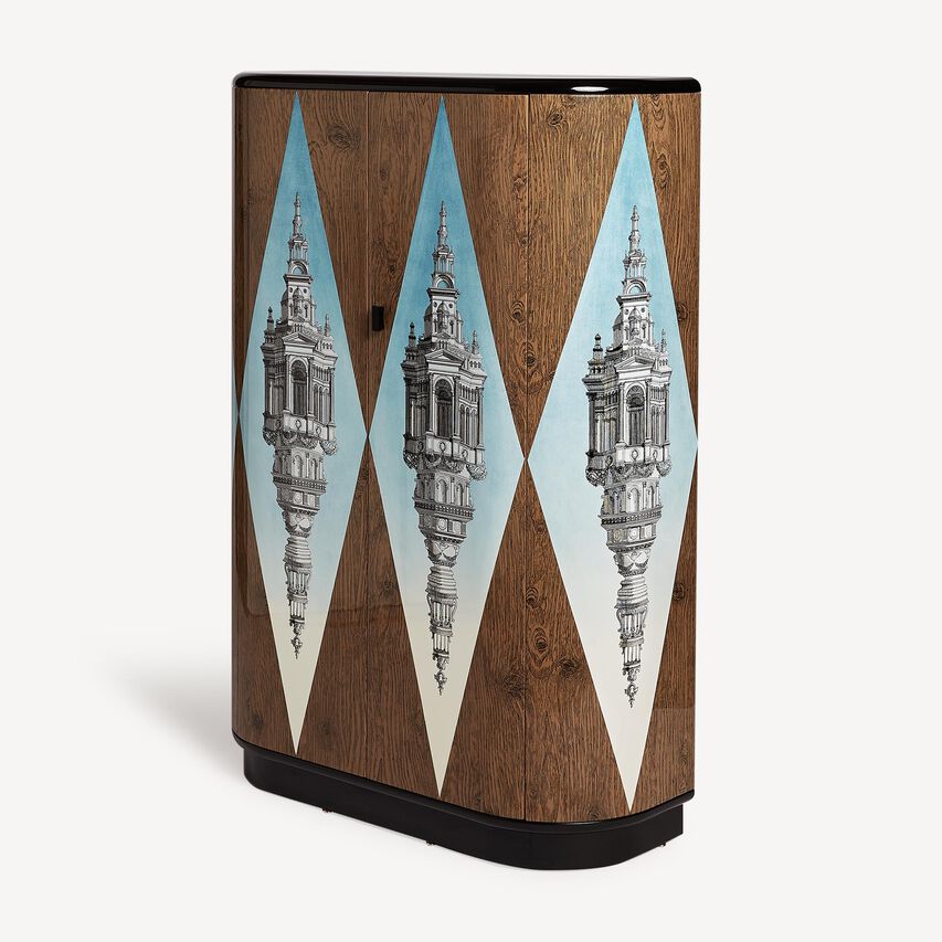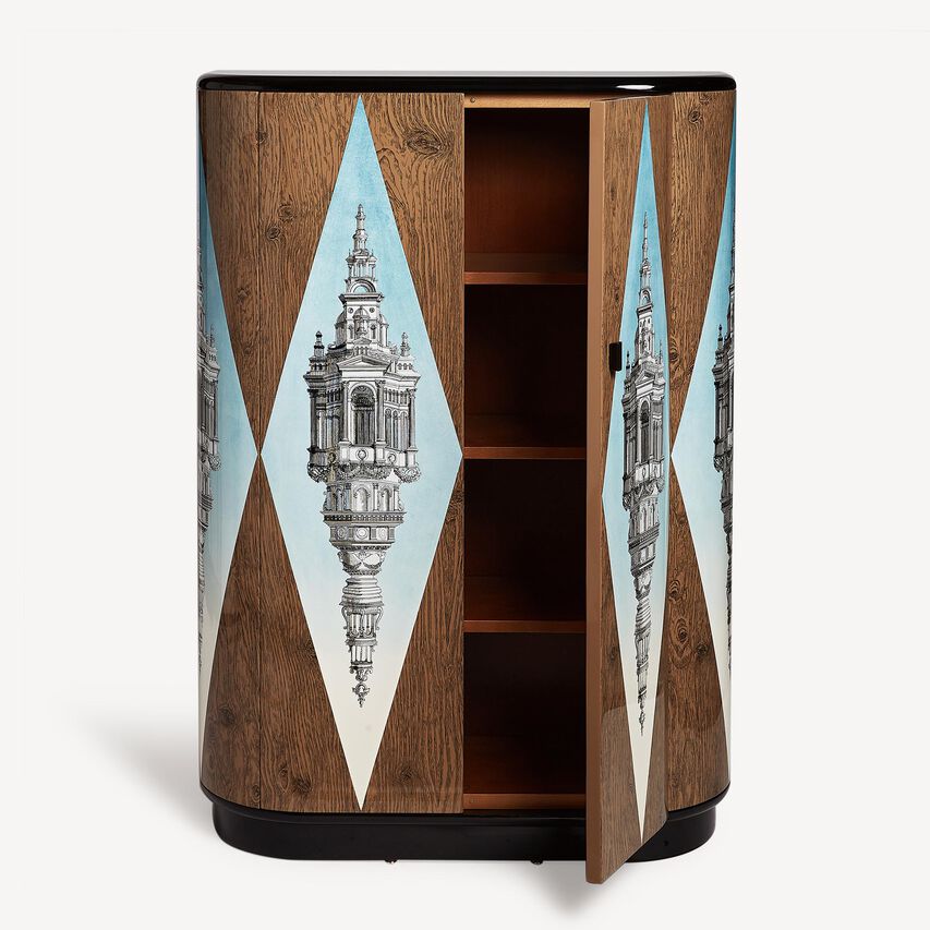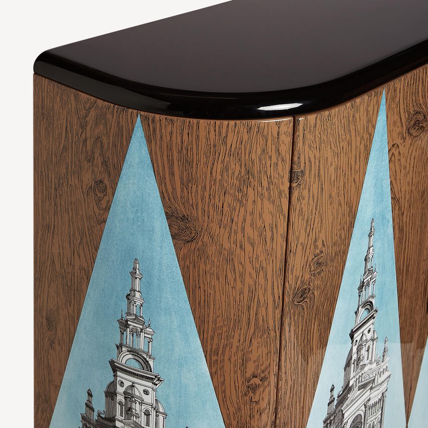 凭借其优雅的圆形造型,弧形橱柜立即成为 Fornasetti 的经典单品。这件家具采用手工丝网印刷、绘画和上漆,具有超现实主义建筑的梦幻装饰,配有两扇铰链门和三个可移动的架子,以艺术装饰功能。