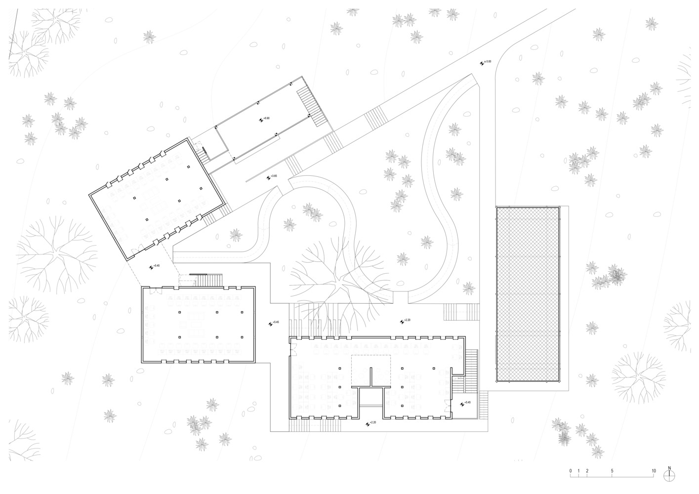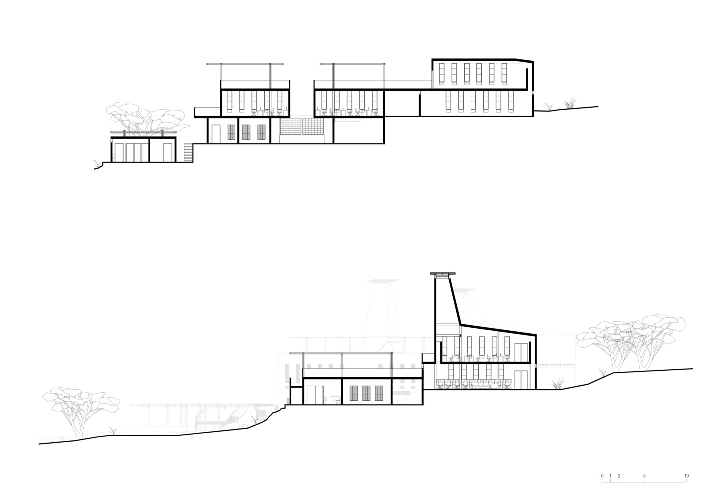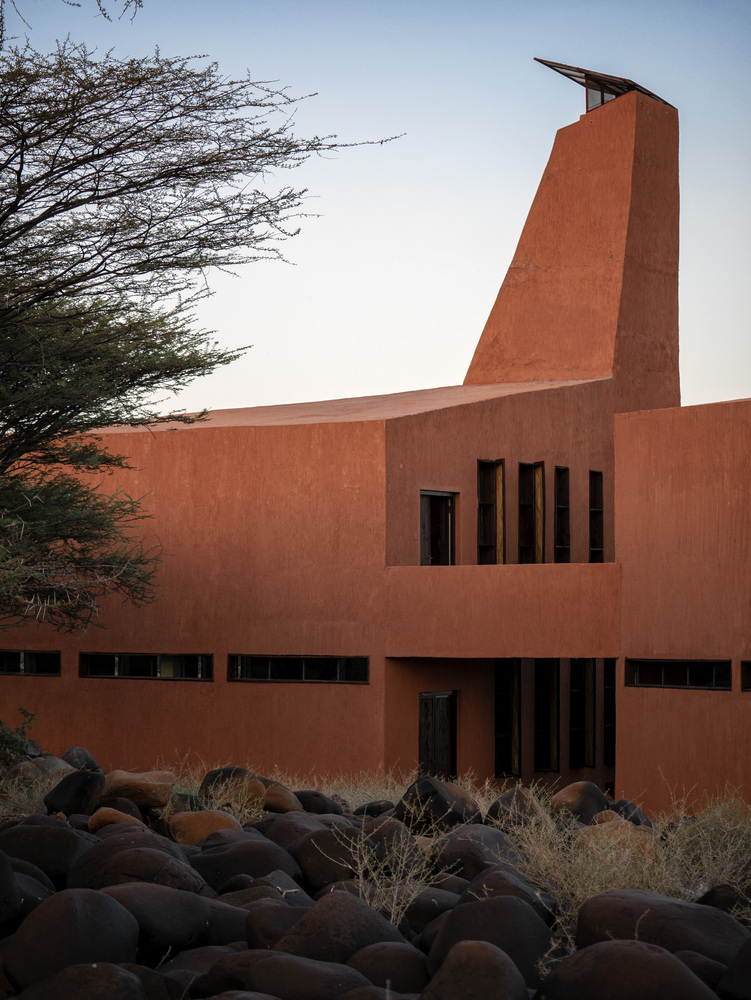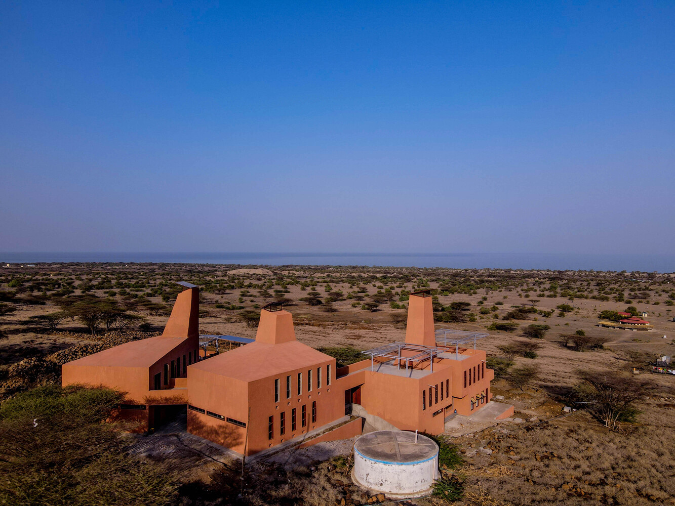肯尼亚“狮子”初创园区是坐落于肯尼亚图尔卡纳湖畔的信息与交流技术园区。其设立旨在应对当地年轻人失业问题,为他们提供高水平职业训练与国际工作机会,助力年轻初创公司在当地存活运营。目前园区可提供100个工作位,理想状态下将在偏远地区推进ICT网络资源。 该项目由Kéré Architecture设计,尊重当地地形与自然环境,依坡而建。延伸的屋顶露台可赏图尔卡纳湖,被爬藤植物包裹遮阳,是室外聚集和灵感交流的理想场所。 项目灵感源于当地白蚁群建造的高耸土丘,高耸通风塔抽离热气,新鲜空气从特定低开口进入,保证工作空间凉爽舒适,且塔形设计成为园区地标。 建材选用当地采石场带石膏饰面的材料,综合考虑生态可持续性、造价和实用性。项目决策过程中与当地社区深度互动,汲取居民经验。