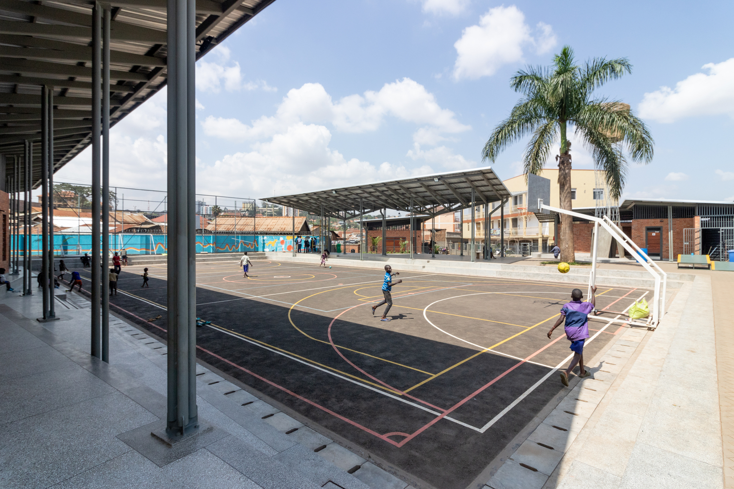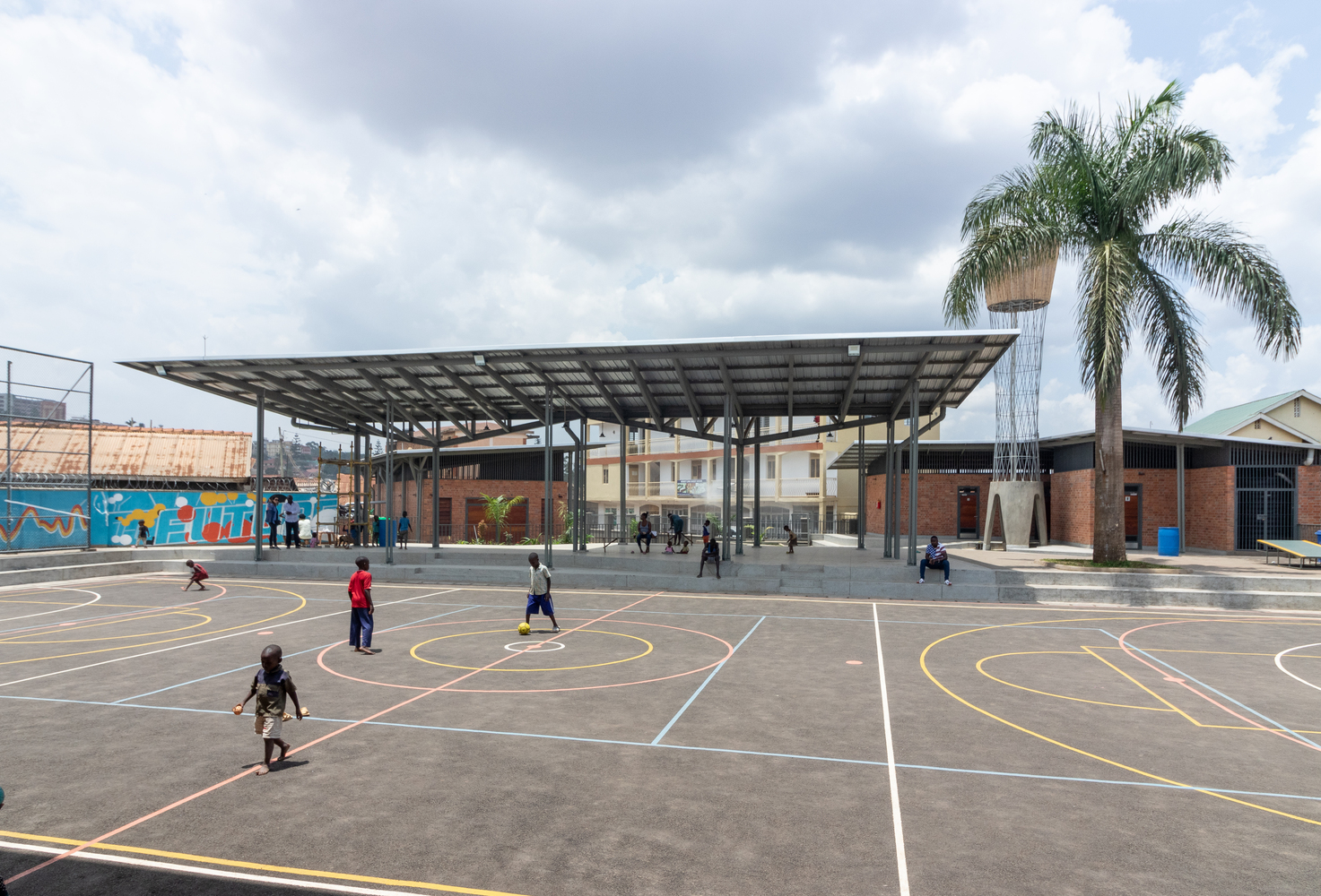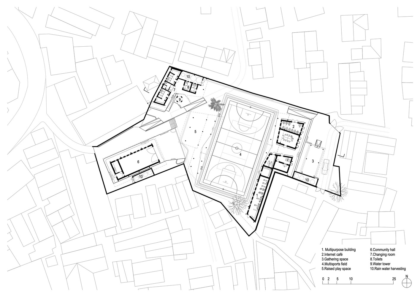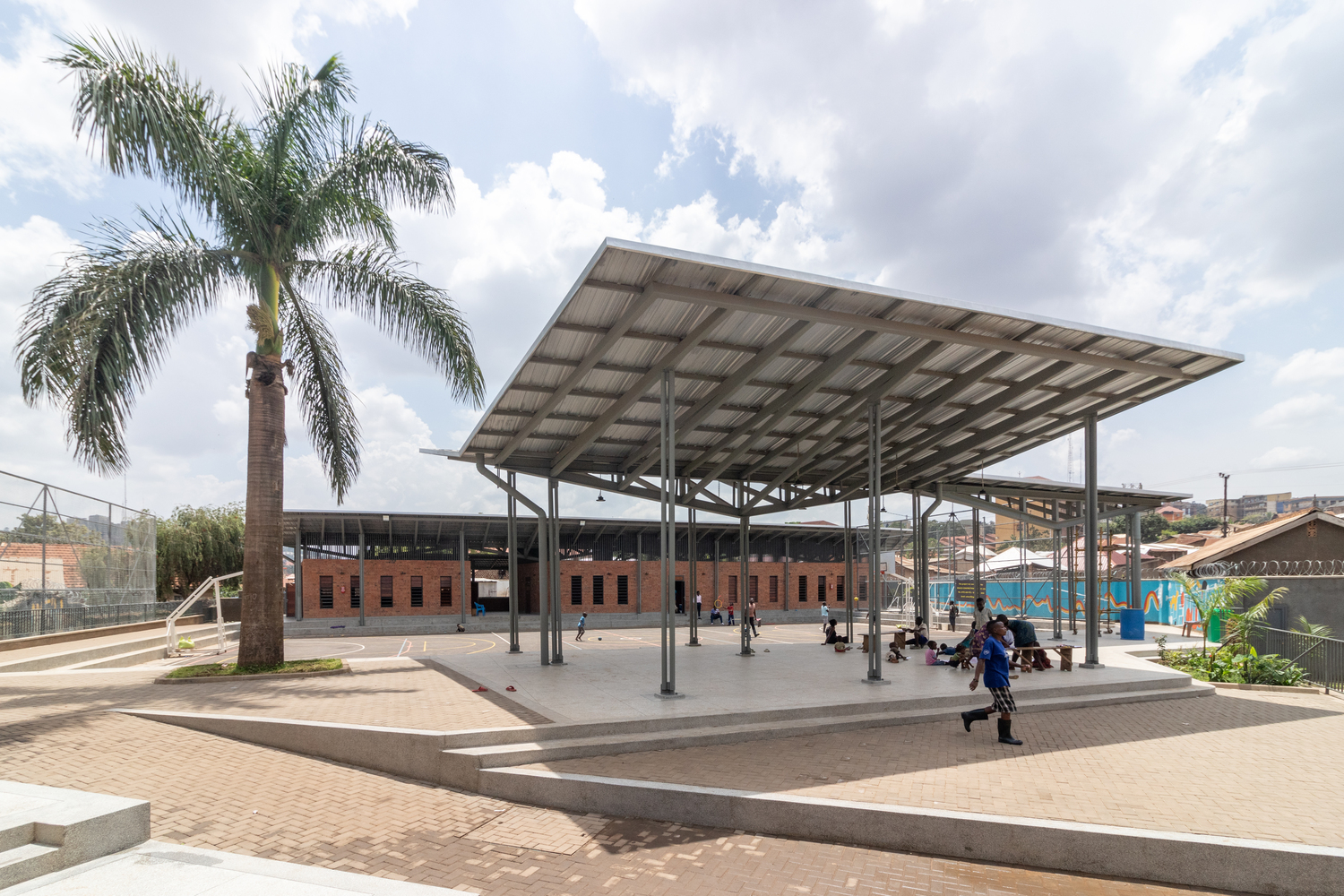 来自建筑师的介绍:Kamwokya社区中心由当地非营利机构Kamwokya基督教关怀社区(在乌干达首都坎帕拉最贫困地区之一开展体育、休闲和艺术活动)与Ameropa基金会(运作国际项目改善边缘社区生活)合作打造。 该项目由Kéré Architecture设计,目标是维持并强化场地的公共性与自由性。建筑师在原有场地和建筑环境基础上进行改善,未让社区中心脱离背景条件而孤立。项目中的游乐场为体育训练、比赛、聚会、社区活动、研讨会、音乐舞蹈课等已有的活动提供了更便利空间。 项目建在设有高效排水系统的平台上,以应对暴雨洪涝。平台通过水平差异划分区域,可让多种活动同时开展互不干扰。主要运动场具备排水和遮阳功能,四周阶梯可作非正式聚会或观赛场所。 平台上有两座自然通风建筑,内含小型健身房、网吧、多用途教室和研讨室、音乐工作室、办公室及相邻公共厕所。这些空间由两个钢结构抬高的蝶形屋顶覆盖,利于空气流通,也使场地在城市中极具辨识度。 除实际功能外,该项目还希望成为灵感与自豪感的来源,改变社区,培养居民的管理意识与归属感。