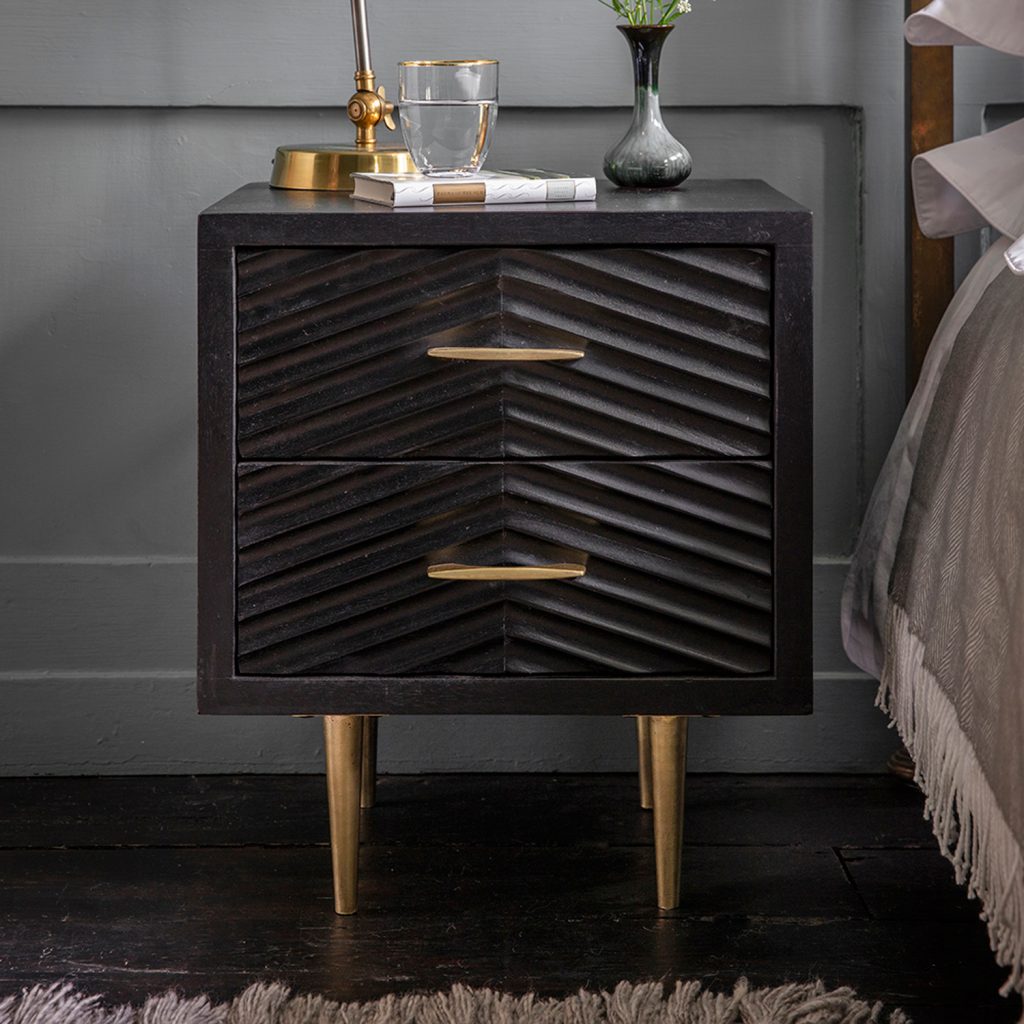 使用 Atkin and Thyme 引人注目的 Fandango 床头抽屉在卧室或客房中营造一个焦点。棱纹黑色芒果木饰面与镀黄铜腿和把手相得益彰,而两抽屉设计提供了大量方便的存储空间。匹配的餐具柜、抽屉柜和媒体单元也可用于在您的整个家中完全协调的外观。