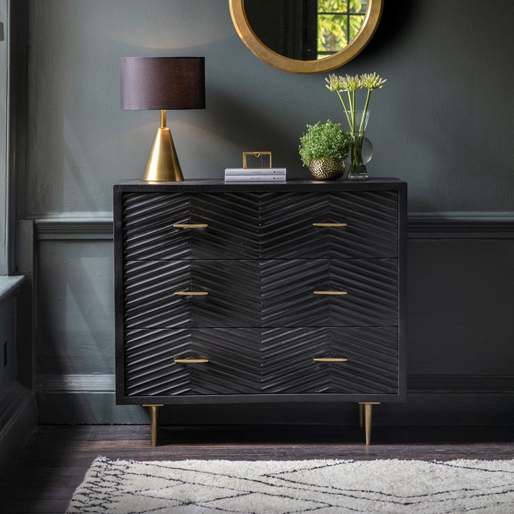 这款三抽屉 Fandango 抽屉柜提供充足的衣物和配饰存储空间。凭借其独特的黑色芒果木饰面和镀黄铜腿和把手,它一定会在任何卧室方案中脱颖而出。作为一个独立的作品使用,可以立即产生影响或在整个家中营造协调的外观,查看 Atkin 和 Thyme 的配套餐具柜、媒体单元和床头柜。