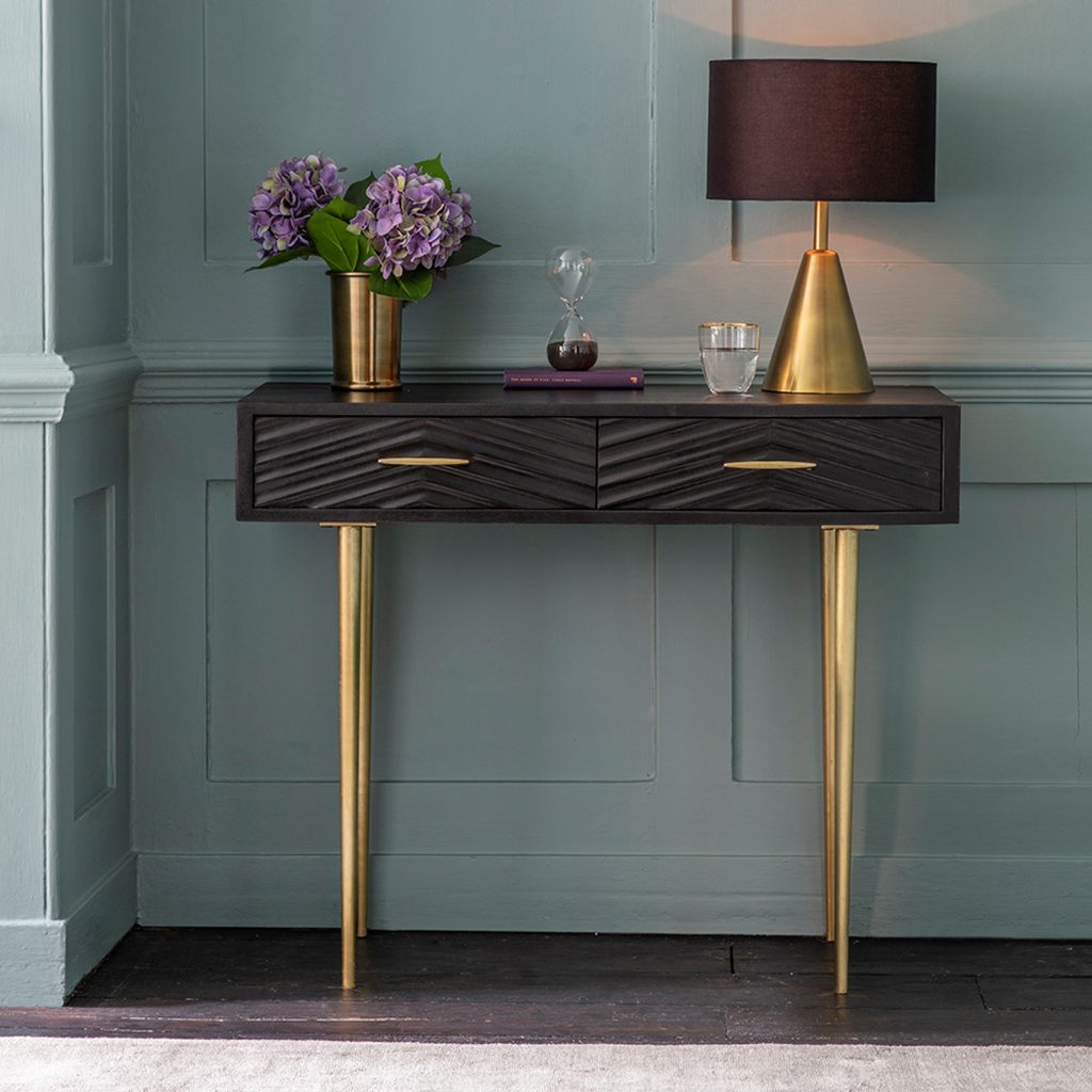 Fandango 控制台将成为一个梦幻般的梳妆台,因为其独特的黑色芒果木饰面与镀黄铜的腿和手柄散发出奢华和优雅。两个抽屉方便存放珠宝、化妆品和配饰。它也可以用于走廊或楼梯平台,用于存放钥匙、充电器和账单,以及用于家庭办公室或开放式空间的办公桌区域。