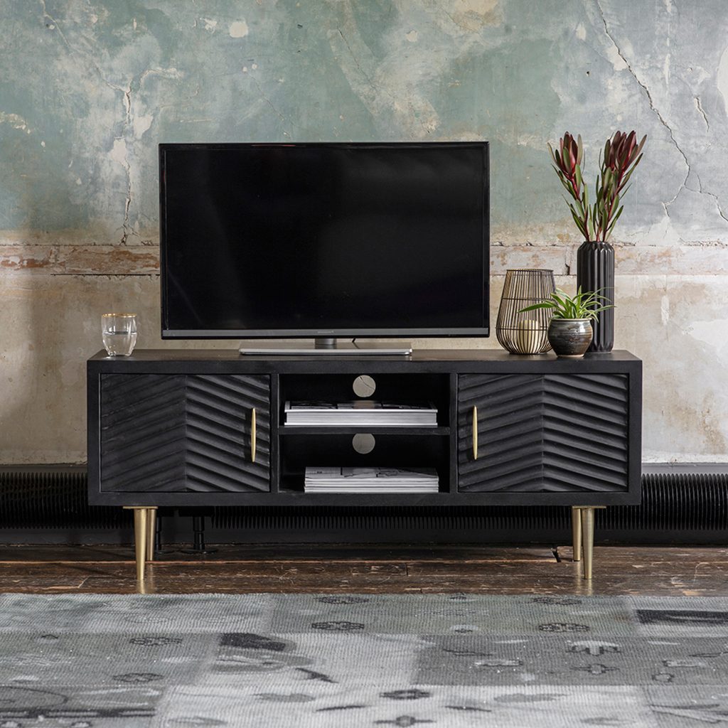 智能媒体单元是将所有电视、音乐和在线游戏设备保存在一个地方的必备工具。Atkin and Thyme 的 Fandango 媒体单元具有开闭门存储,方便取用,具有独特的黑色芒果木饰面,镀黄铜腿和把手,营造出令人惊叹的奢华细节。