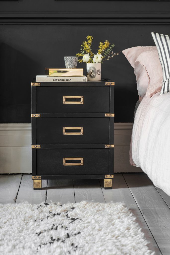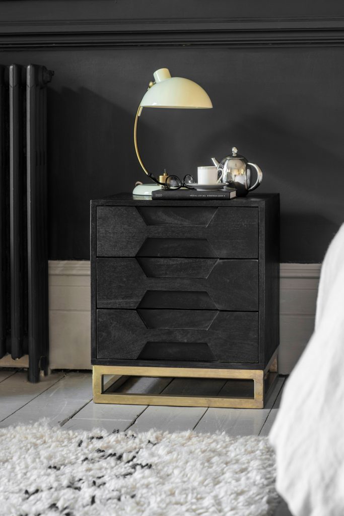 使用黑色染色芒果木单元保持简单,采用对比鲜明的黄铜饰面,带来一丝实用时尚。Atkin and Thyme 的六角床头柜是主卧室以及客房或青少年空间的绝佳选择,是一款经典低调的设计,可与任何室内风格相得益彰。