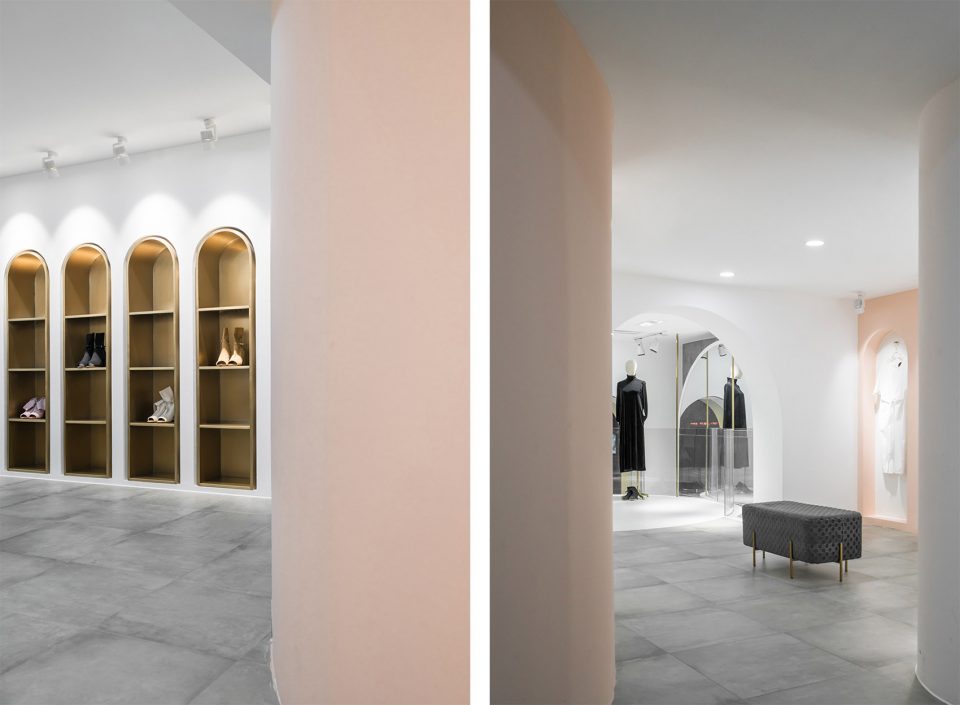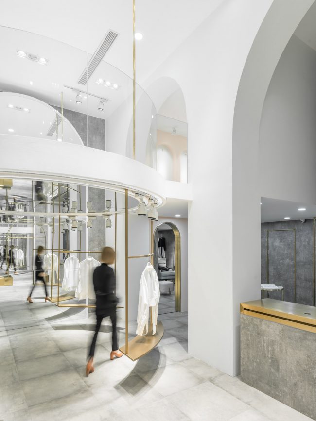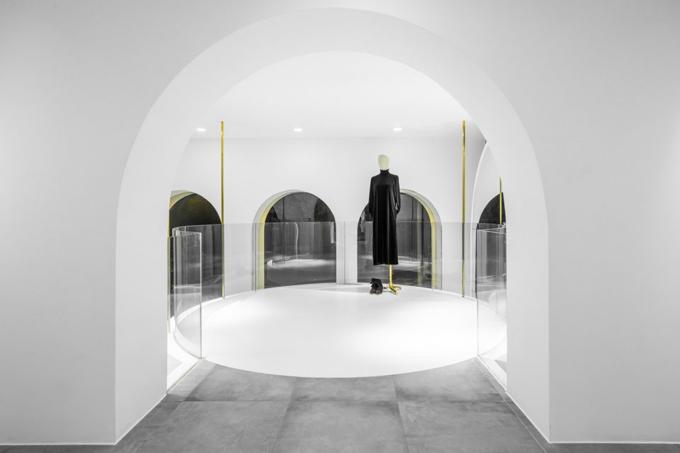 ▼绕过吊杆围合的新品展示区,一扇大拱门限定出下一个空间的入口, Bypassing the new arrival showcase, a large arched door restricts the entrance to the next space