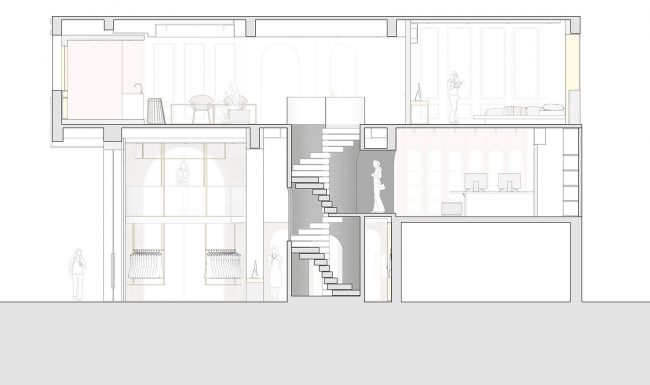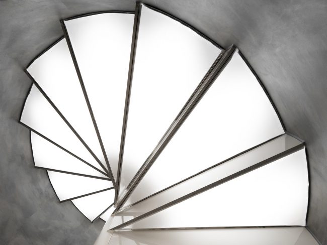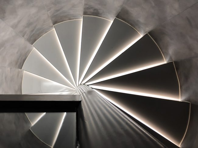 Spiral staircase is enveloped by rough textured curved wall. Ascending the steps, different windows offer different perspectives on the shops, giving a feeling of climbing in a medieval gothic church towers.