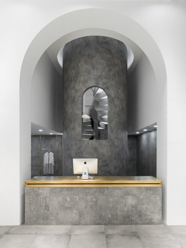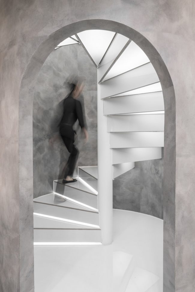 螺旋楼梯被粗糙质感的弧形墙面包裹,拾级途中,不同窗洞提供窥视店铺的更多角度,如同攀爬于中世纪哥特式教堂塔楼的空间之中。