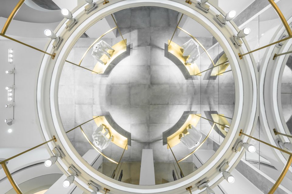 ▼圆形漂浮的楼板衔接着弧形的栏杆与黄铜挂杆,与楼梯筒对应形成一虚一实的形态关系。墙面上相对而立的镜面玻璃相互反射出深邃的视觉通廊,The circular floating slab joins glass railings and hanging rods, which forms a virtual and imaginary relation with the stairwell. The mirrors on the wall create a visual corridor by interreflection