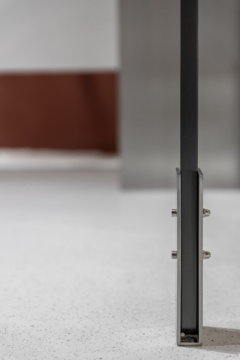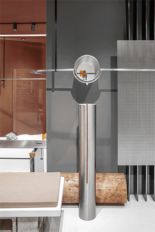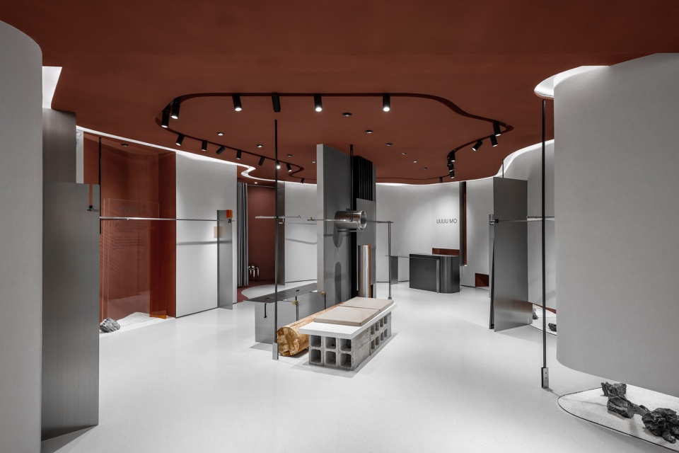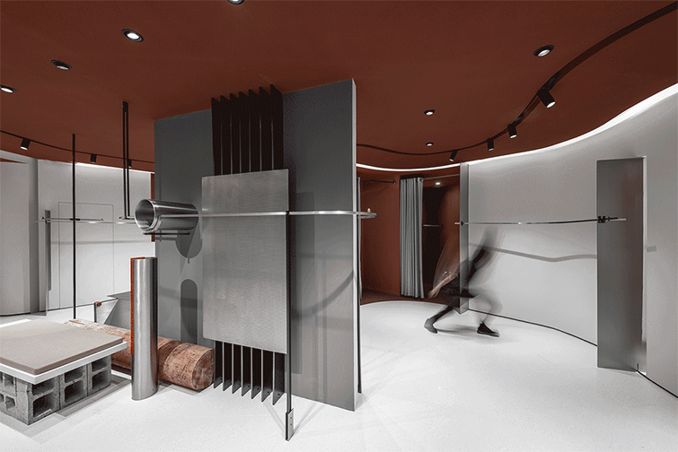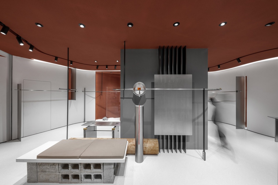 The buttonholing and attaching in clothing production is the process of assembling buttons and other parts to clothing and making holes. In this design, the designer used industrial materials such as stainless steel, perforated plates, and hollow concrete bricks as the “parts” of space display props. They were spliced and combined with each other in a relatively bare and direct way, assembled into the space. Holes were deliberately cut out at the interface of the props and wall’s surface, exposing the sandalwood red natural stone paint inside the wall, thereby magnifying such an industrialized production and assembly process. Through such a “buttonhole” action, the designer hopes that some experiments about human scenes and discussions about “antisense associations” will be left through the details of the meets of different materials: the clothing industry (including the construction industry), whether it’s artificial nature or returning to nature, the plots of large machine production and the feelings of hand-woven textiles, and the humanity contradictions and lingering between privacy and spying on clothing and architecture as “human skin extension”.