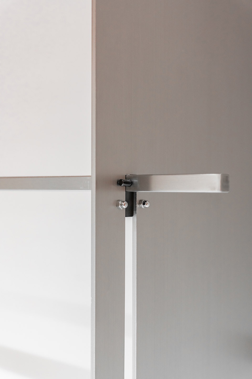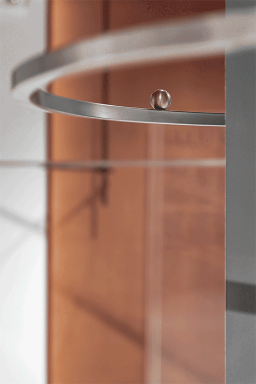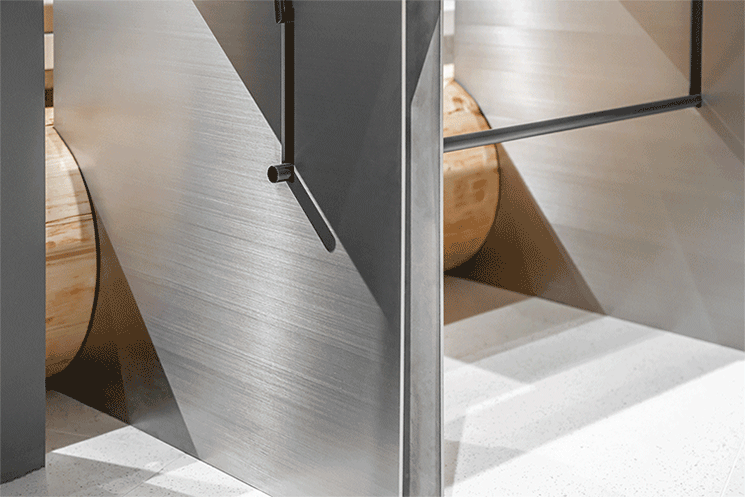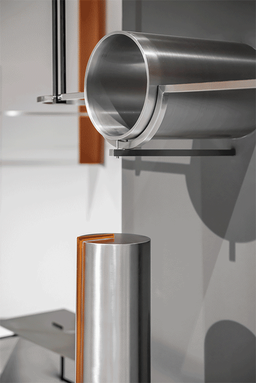 服装制作中的锁眼钉扣是将纽扣等“零件”装配到衣服上并开孔的的过程。在本案的空间设计中,设计师用不锈钢、穿孔板、水泥空心砖等工业化材料作为空间陈列道具的“零部件”,以较为裸露直接的方式相互拼接组合,装配到空间中,并在道具与墙面交接的位置刻意切出孔洞,露出墙面内部红色真石漆的部分,从而放大这样一个工业化生产与装配过程。通过这样一个“开孔钉扣”的动作,设计师希望在不同材料交接细节之间,能留下某些关于人性场景的实验与“反义关联”的一些讨论:服装工业(包括建筑工业)是在人造自然还是回归自然,大机器生产的情节与手工纺织的情怀,同作为“人类肌肤延伸”的服装和建筑在私密与窥探之间的人性矛盾和徘徊。