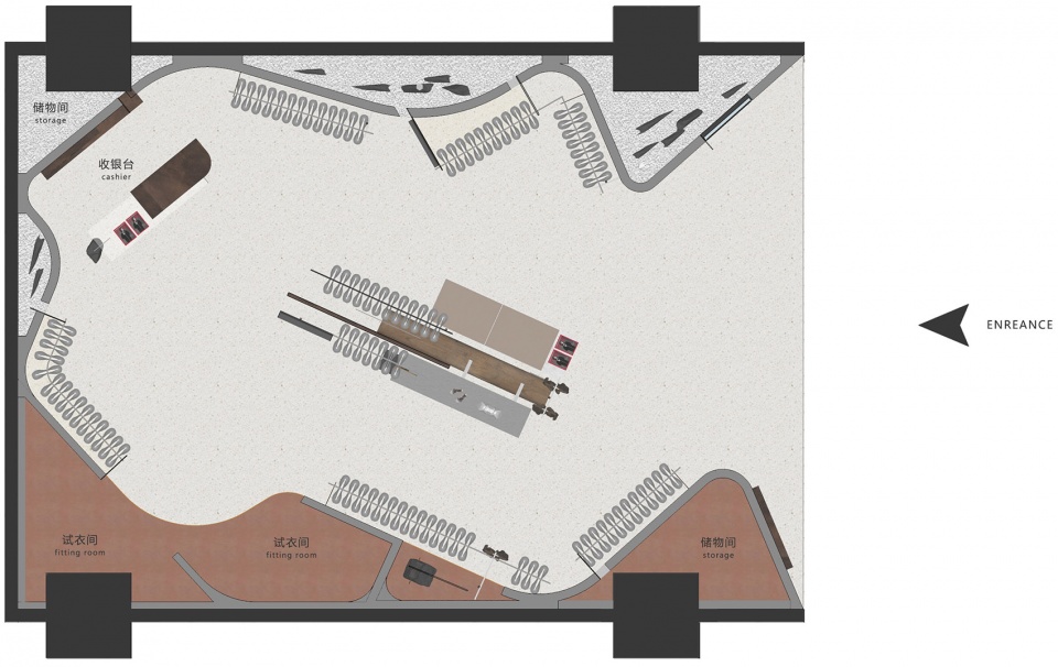 This design abandoned the over-design in visual merchandising in the traditional commercial space of clothing business; instead, it integrated and connected front display, clothing display, fitting room, storage room, cashier and other functions by a streamlined wall. That can be seen as “one-piece” in architectural space. The natural streamlined structure is shaped by such a relatively industrialized method, it is a structural reorganization of the functional layout, which also makes the clothing display area have a more complete and pure display surface, so as to obtain a clearer and more efficient circulation and a larger visual effect.