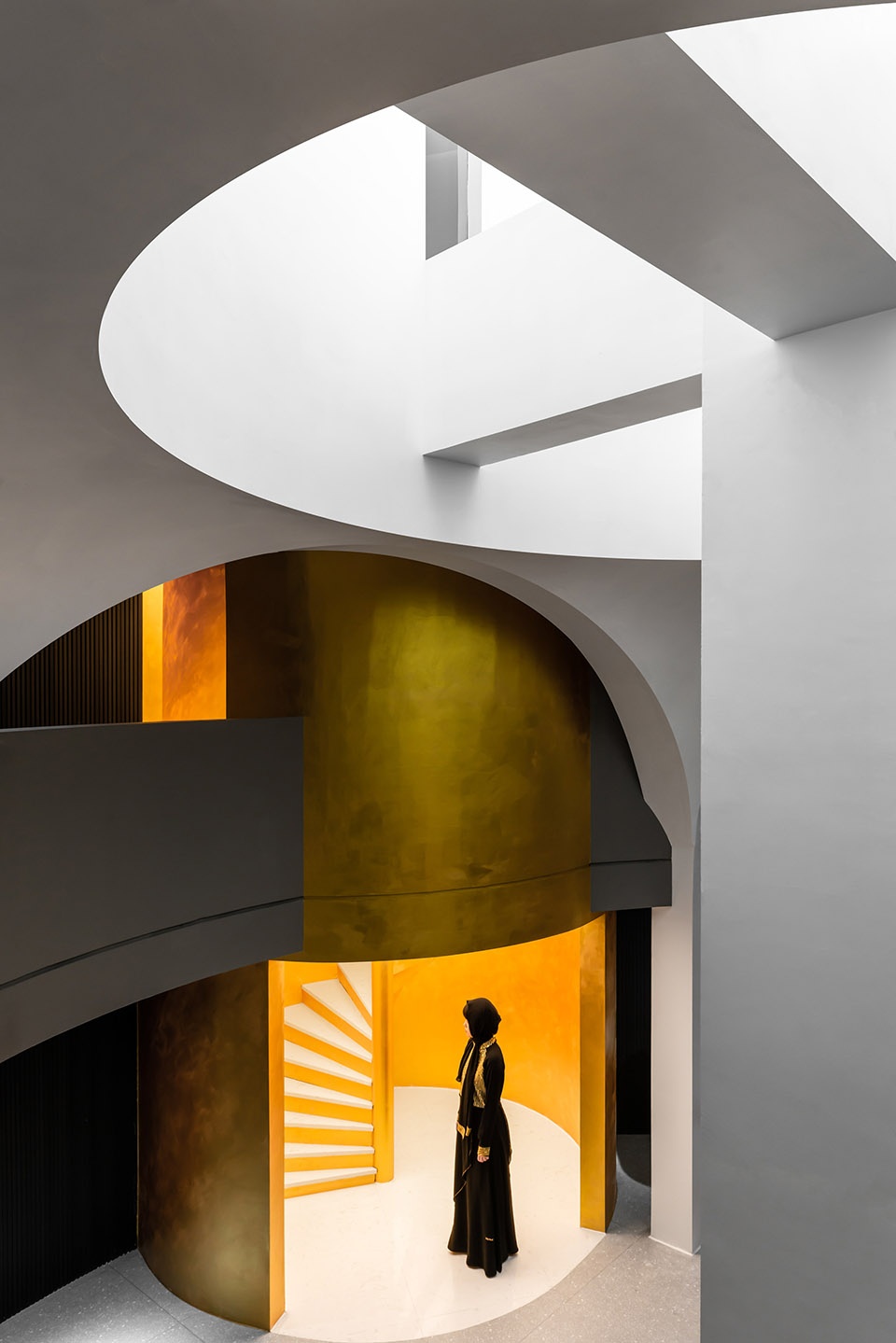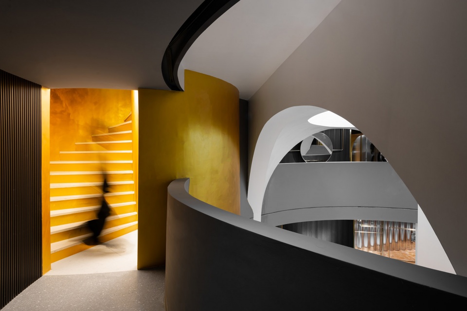 螺旋楼梯被包裹在一个圆筒体量之内,贯穿联系起三层空间,布置于以中心立柱为轴线的一侧,跳脱的颜色与体量感,使楼梯成为二三层引流顾客的关键点。而其偏心的布局方式打破各个方向都均衡对称的整体布局状态,消解对于经典对称关系的纯粹模仿,达成“陌生化”的暗示。