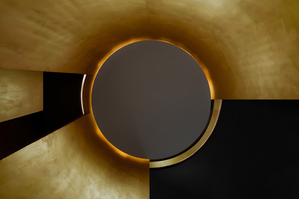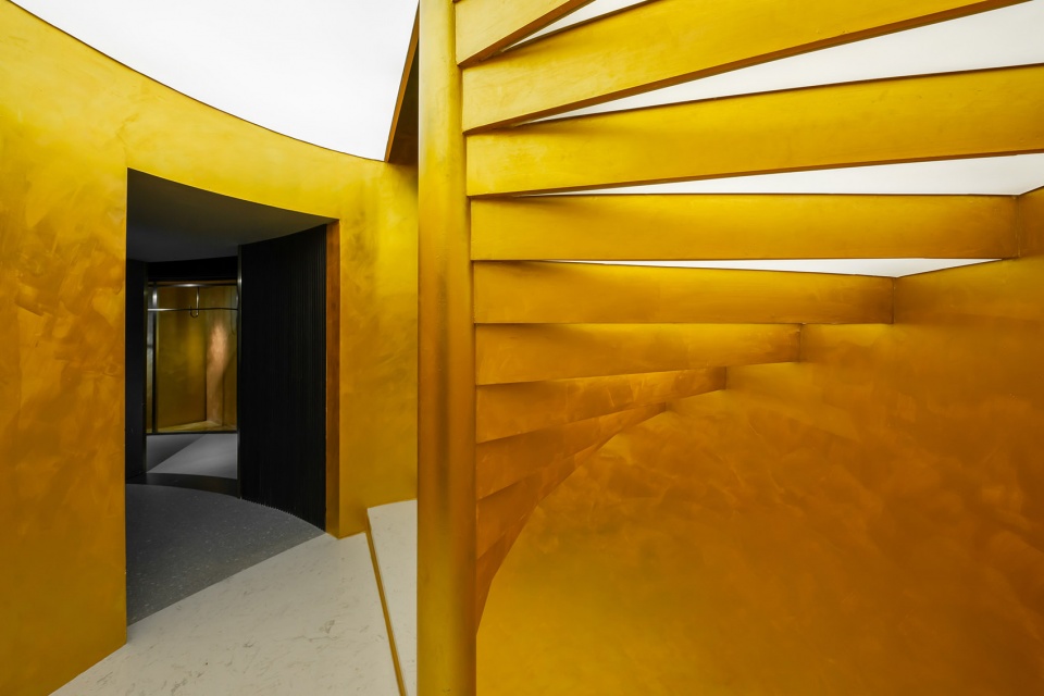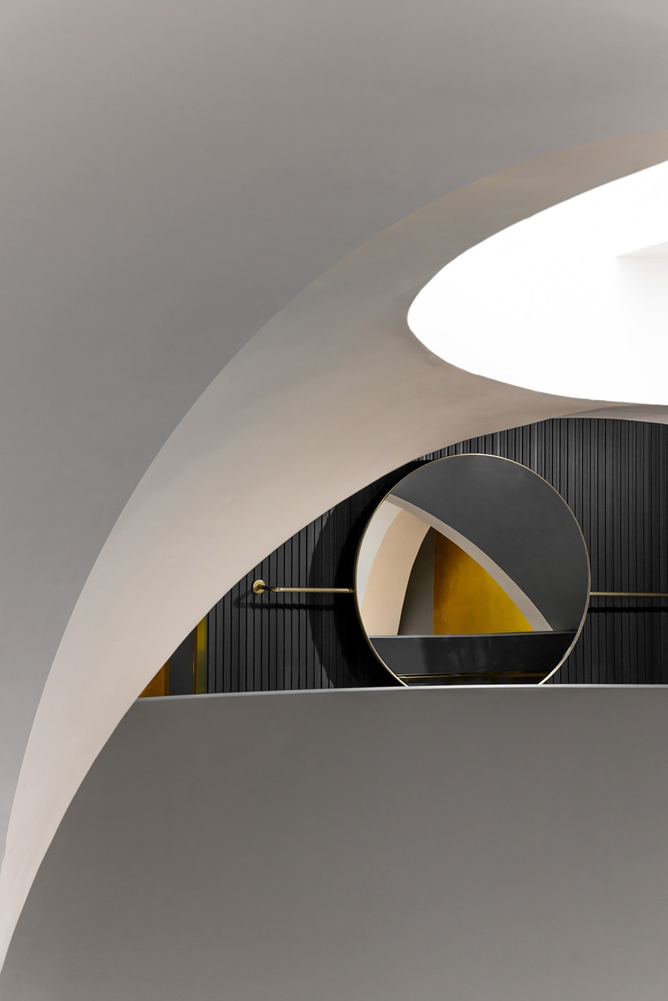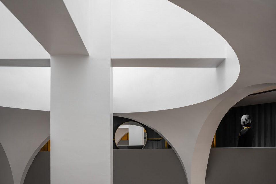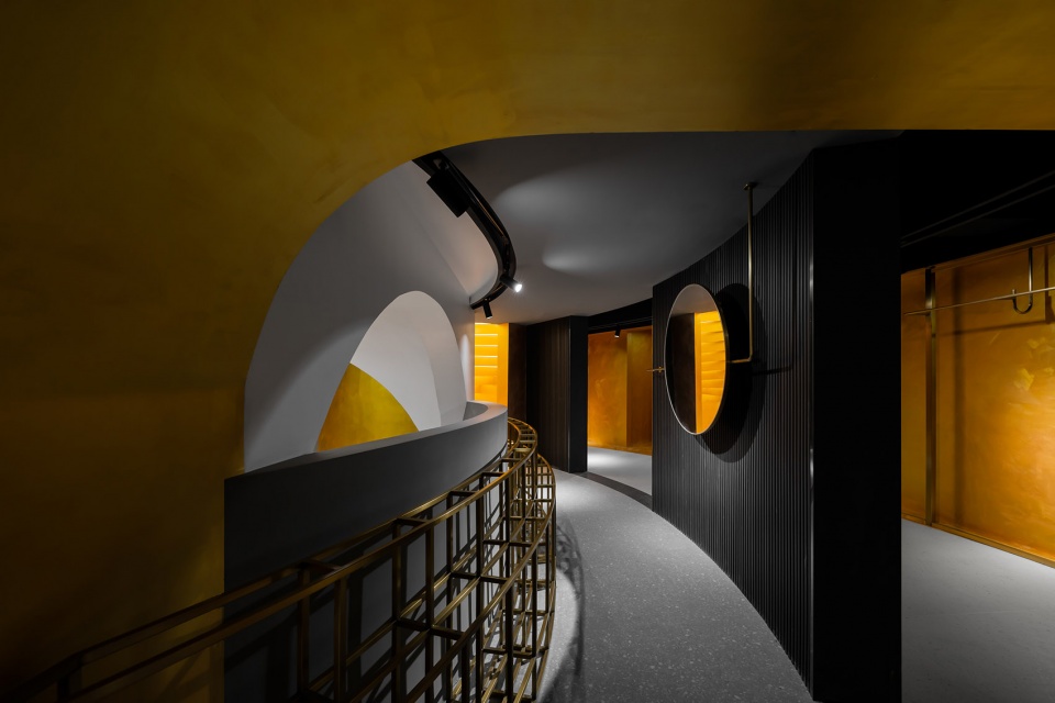 The heavy pendentive is enveloped by the winding corridor so the customers on ground floor covered by the pendentive are able to see the back of it (a back side that does not exist in classics). The cave-like appearance will arouse the desire of customers on ground floor to see what it is like in the atrium.