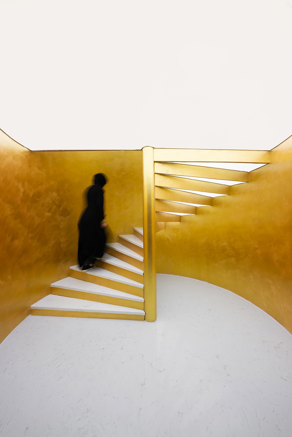 螺旋楼梯筒内,台阶底部被安放均匀的灯模,使整个楼梯筒向外溢出光线,达到最大化的昭示,吸引顾客向上行走。同时,借由此光源,与穹顶光照一并,形成几层空间的主光源,意在以节制的光感塑造除布局、空间以外,第三个层次的“陌生化”。