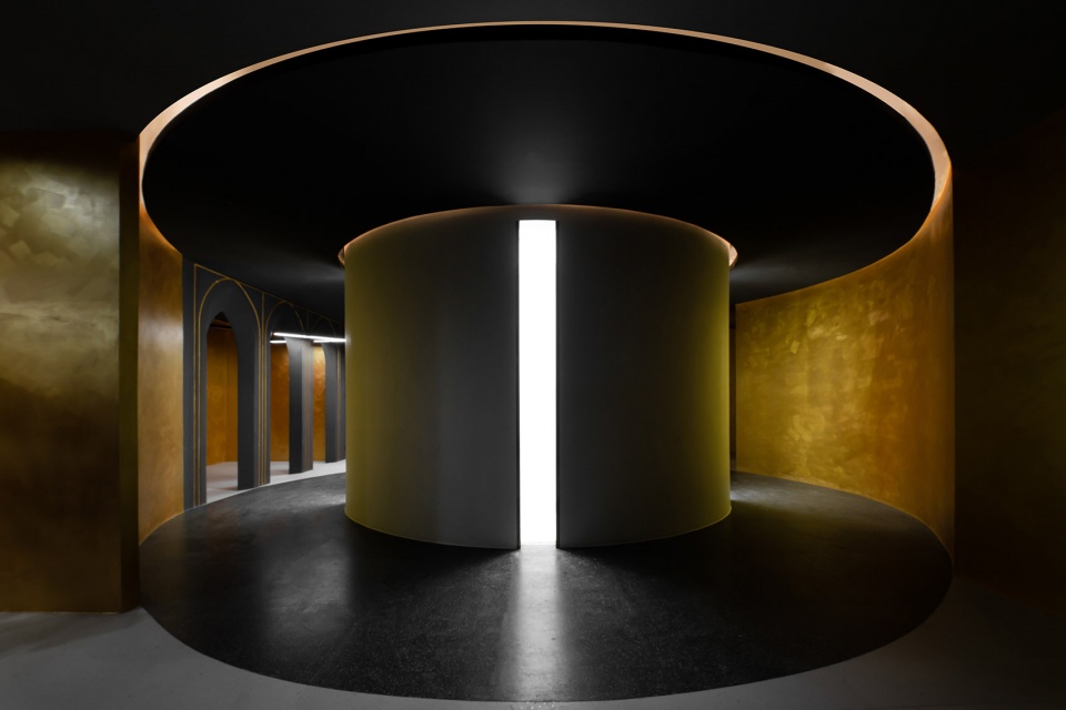 一层的服饰展示回廊被多个环绕中庭立柱的同心圆形成的弧形墙体、天花地花造型、道具挂架及灯带等所界定,形成回字形的浏览路线,并能通过向心发散布置的出入口与中庭连通。回型布局、向心与发散,不仅最大限度使四周墙面作为展示之用,更能紧密的围绕具有仪式感的中庭空间。