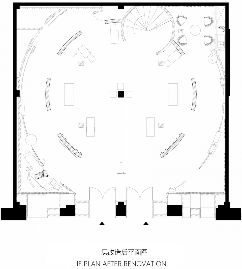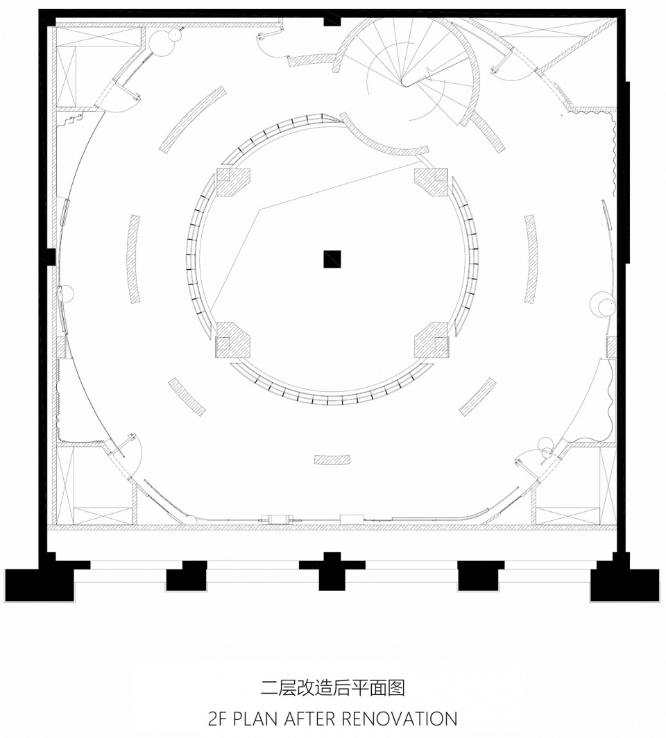 打破帆拱穹顶完整性的原有的十字梁柱,同时保留着原有建筑骨架的痕迹,是整个设计思路的起点,也是“经典被陌生化”的一个重要的切口:它弱化了固有帆拱穹顶的外化样貌,使设计摆脱对经典的完全模仿,又极大的增强经典里面蕴含的永恒的品质。