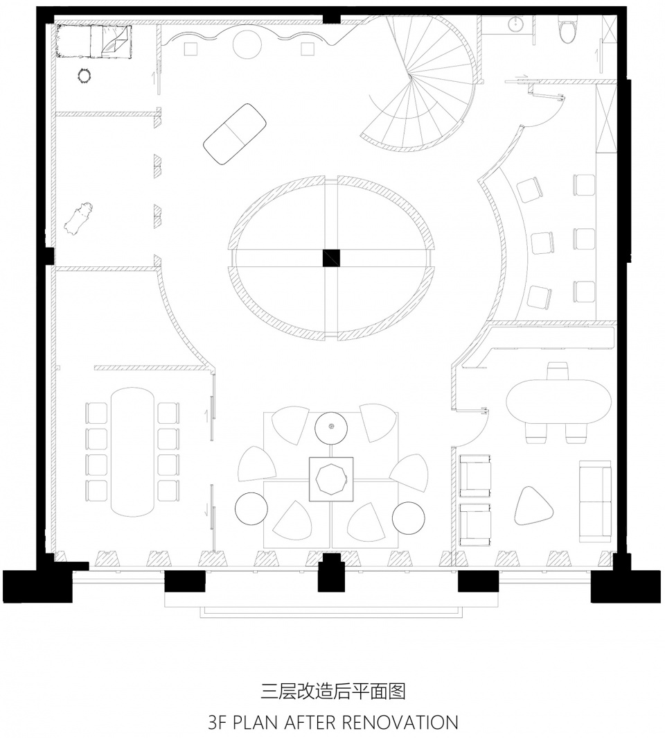 椭圆筒结构由贯穿一二层的帆拱体系支承,这个被“掏空”的筒,不仅为底层空间的延续与光照提供舒展的余地,更构成三层的空间骨架:圆筒表面作为展示墙,结合回廊为VIP客户展示最新产品;儿童活动房、VIP休息区、会议区、办公区等则环绕其布局。