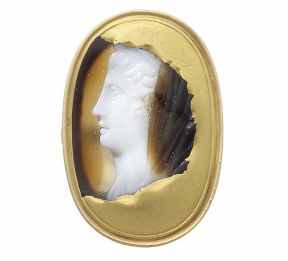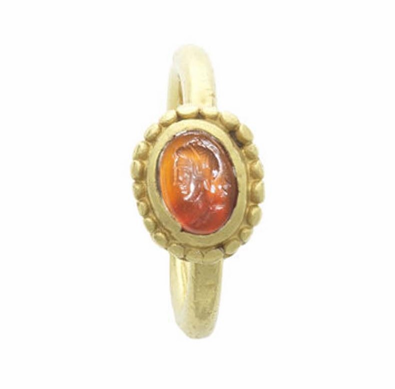 Diana(希腊神话中的狩猎女神)肖像阴刻戒指,采用红玉髓制作,创作于公元5世纪,预估价格1000-1500英镑。