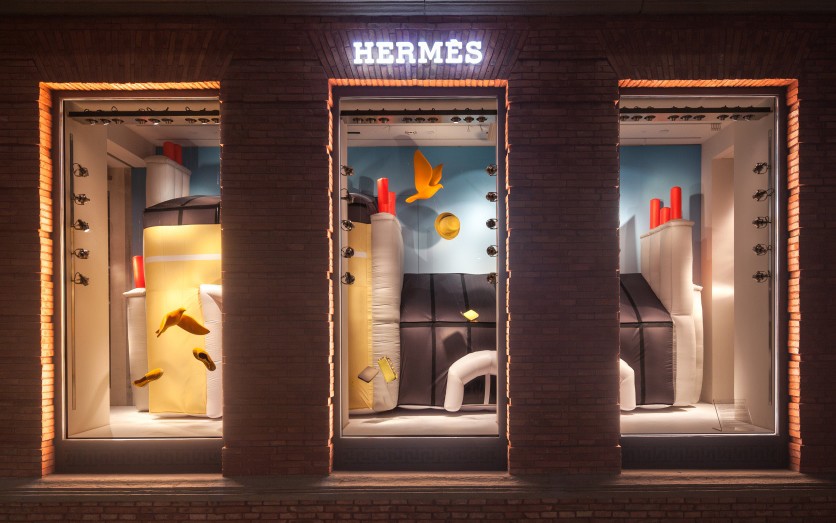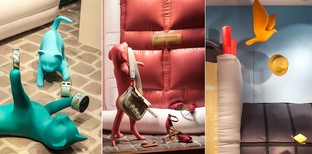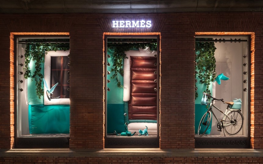 自7月9日起,上海「Hermès Maison」与法国艺术家 Audrey Frugier 合作推出新一季的橱窗艺术——「浮游街区」,这一系列作品以充气材质雕塑重现巴黎街道景观,诠释了爱马仕的年度主题「闲情漫步」。